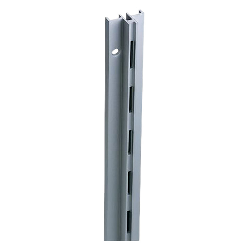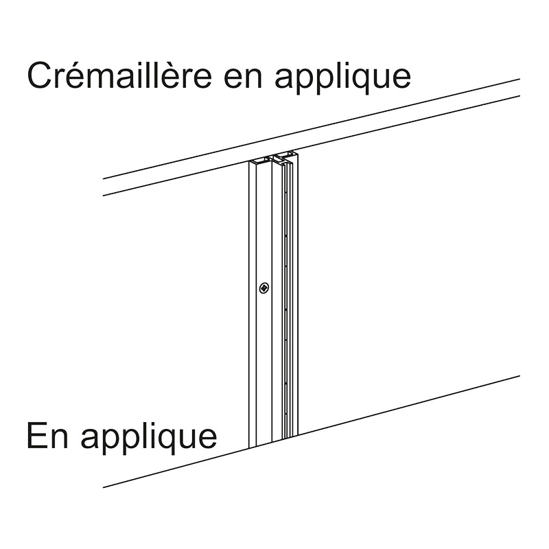 Crémaillère à simple perforation, au pas de 37mm.Polyvalente : pose en applique, avec ou sans habillage de panneaux (épaisseur 8mm). Fixation par vis Ø 4,5mm, avec entraxe 240,5mm.