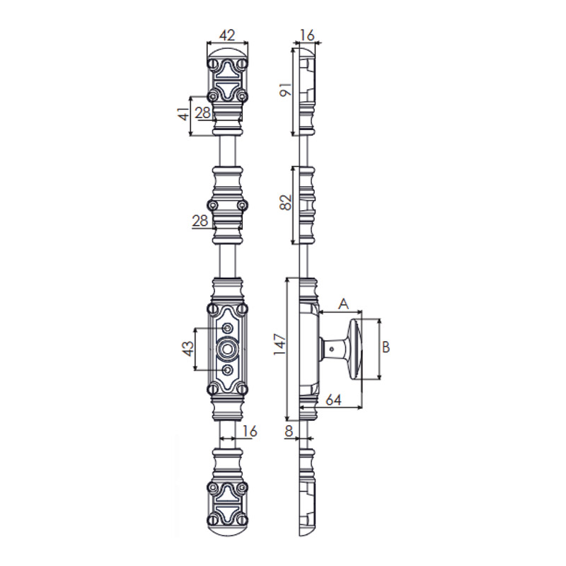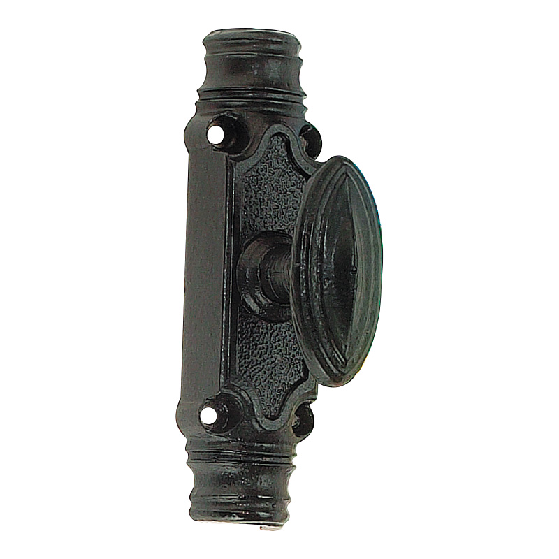 Crémone décorative.Boitier fausse crémone et accessoires en fonte, finition époxy.Pour tringle 1/2 ronde 16 x 8mm (à commander séparément).Composé de :- boitier 147 x 42mm avec bouton ovale ht.66mm- 1 coulant- 2 chapiteaux / gâches à affleurement- 1 carré 7 x 40mm- visserie