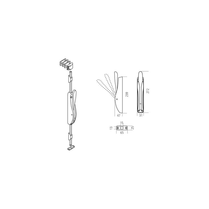 Crémone pompier en appliqueTringle en applique carrée 12x12x2500 mmCourse des tringles 25 mmPoignée à levierFinition aluminium laquéLivrée avec gâches, sans tringle