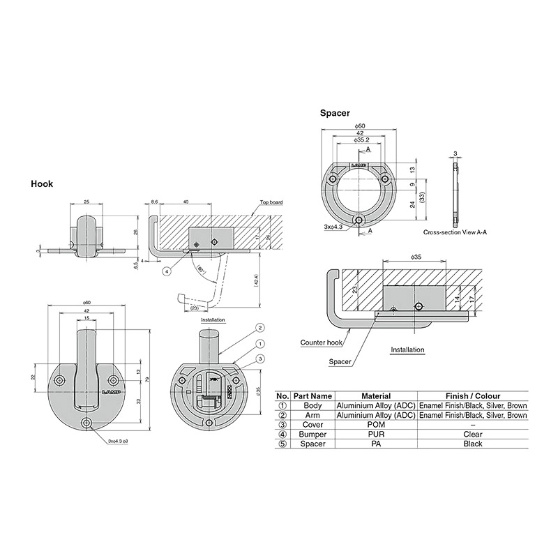 Crochet rétractable. Lorsqu’il n’est pas utilisé, le crochet se rétracte automatiquement.Une fois rétracté, le bras sera visible sur les côtés de la table ou du panneau.Pour panneau d'épaisseur mini. 26 mm.