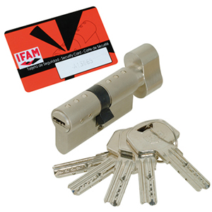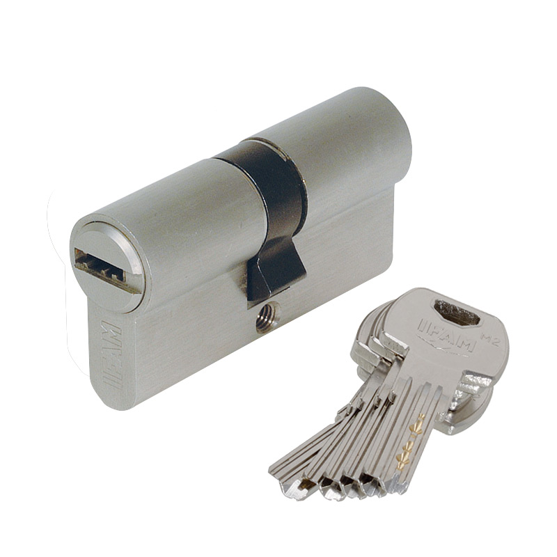 Laiton nickelé 6 pistonsClé réversiblePistons et goupilles renforcés anti-perçageSystème de sécurité anti-crochetageProtection anti-bumpingPanneton DIN débrayableCylindre livré avec 5 clés.Carte de reproductionEN 1303:2015