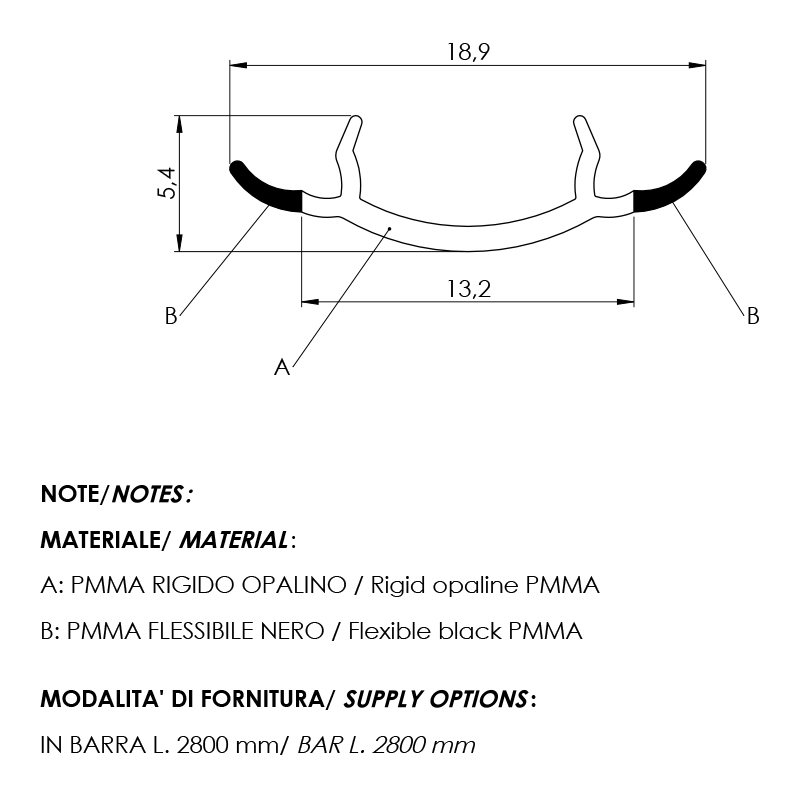 Diffuseur pour led en PMMA (polymère thermoplastique). La partie centrale (A) est rigide et translucide, alors que les parties externes (B) sont flexibles et noires.Il s'insère dans le chant ouvert du profil vertical STILIPHOS et ELLIPSE, les parties externes venant recouvrir parfaitement le profil.Associé à une bande led, il diffuse la lumière sur la hauteur de la structure, par l'arrière.