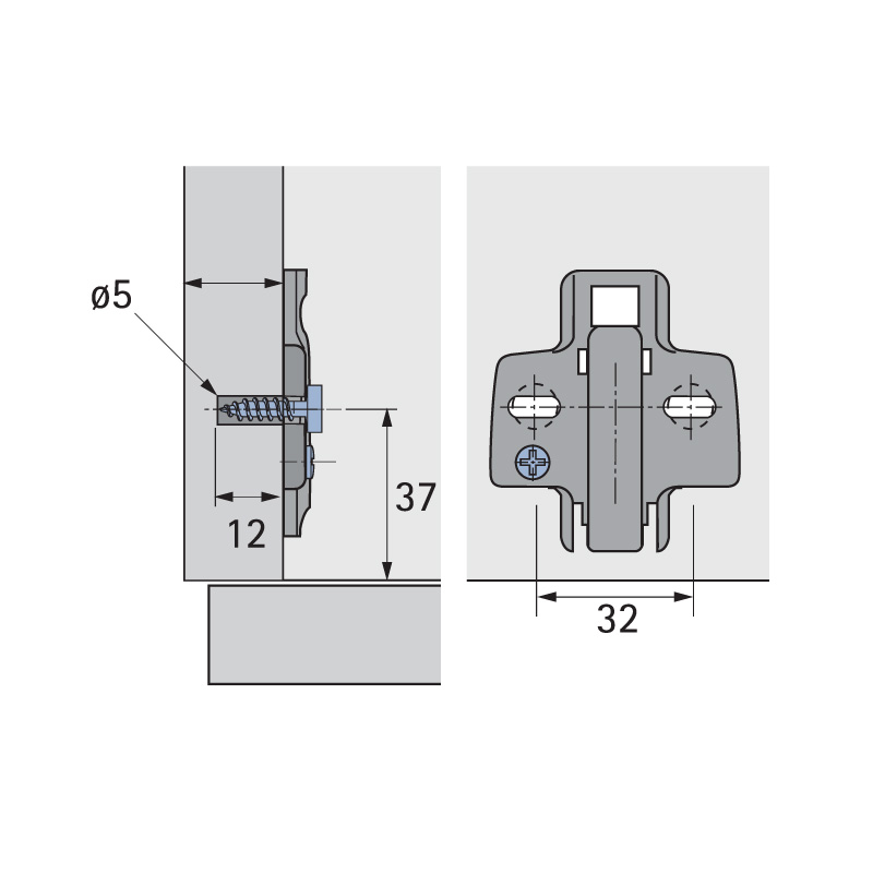 Réglage vertical par excentrique ± 2 mm.Avec vis spéciales prémontées et manchons en plastique pour perçages ø 5 x 12 mm.