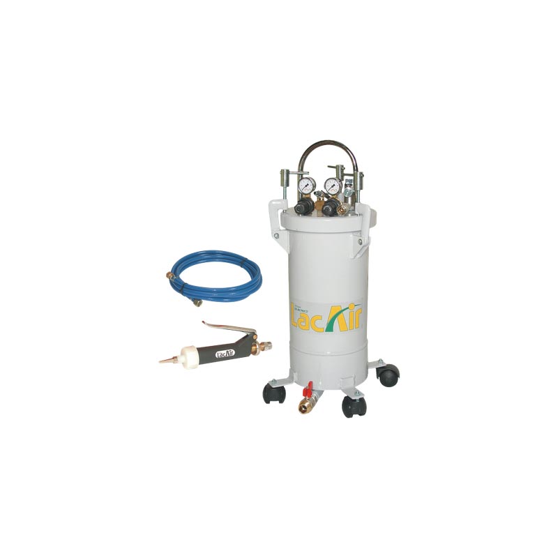 Pot sous pression 10 litres, recommandé pour menuisiers, ébenistes et agençeurs pour faire des cordons de colles blanches.Pression maxi 4.7 bar.Double régulation air et produit, 1 sortie haute 1/4", 1 sortie basse 3/4", 3 brides de fermeture de couvercle, 4 roues.Cuve en inox et couvercle en aluminium.Poignée circulaire en nylon + fibre de verre, gâchette ergonomique.Passage produit en inox et réglage du débit par molette.