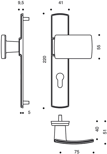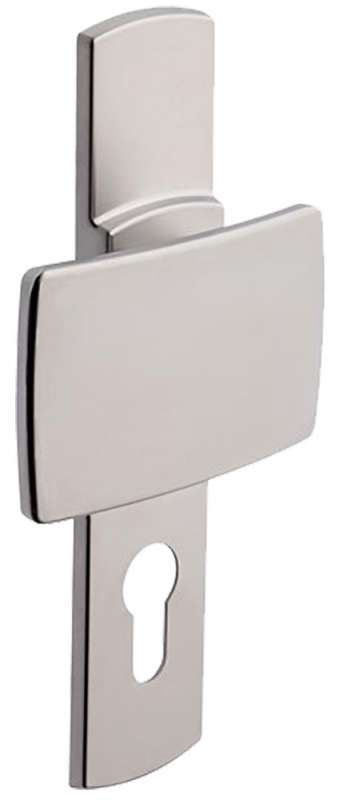 Béquille sur grande plaque 220 x 41 mm, solidarisées.Poignée de tirage coté extérieur, réversible.Plaque fondue avec piliers taraudés intégrés et vis invisibles côté extérieur.Fourni avec vis de fixation M4.Pour porte épaisseur standard 40 mm et serrure entraxe 70 mm.