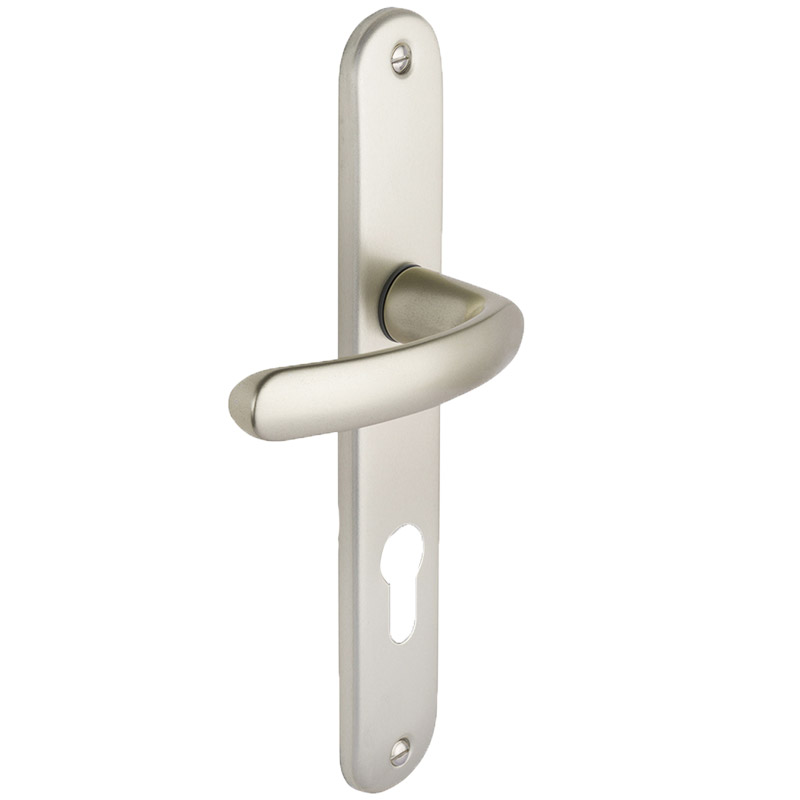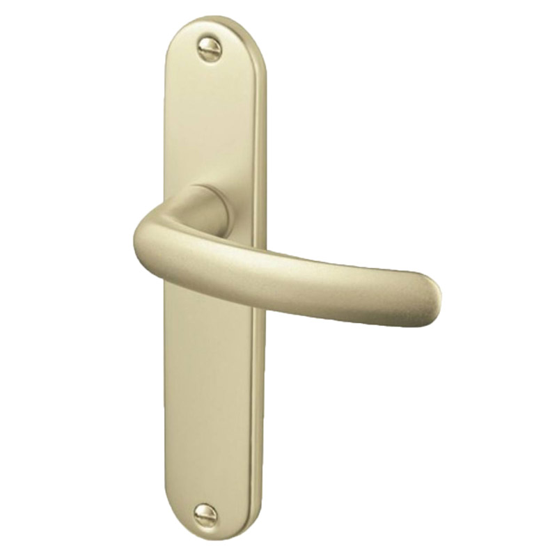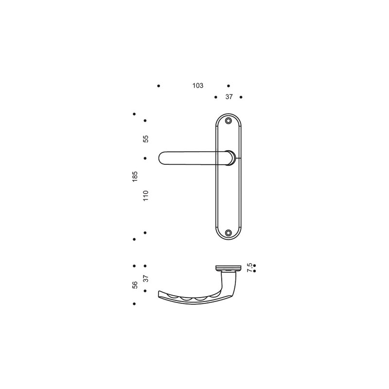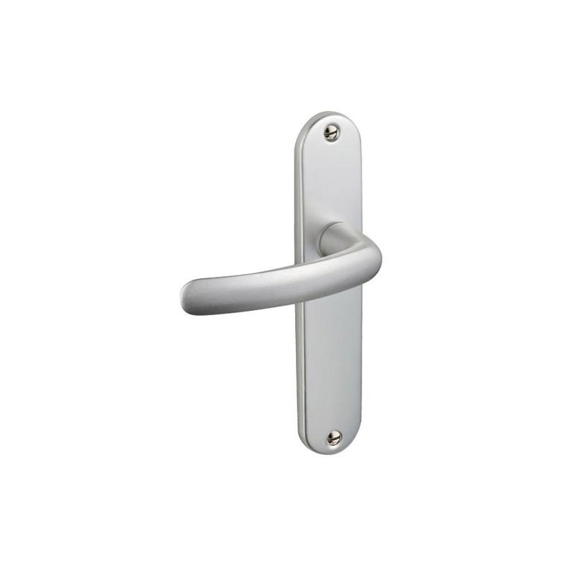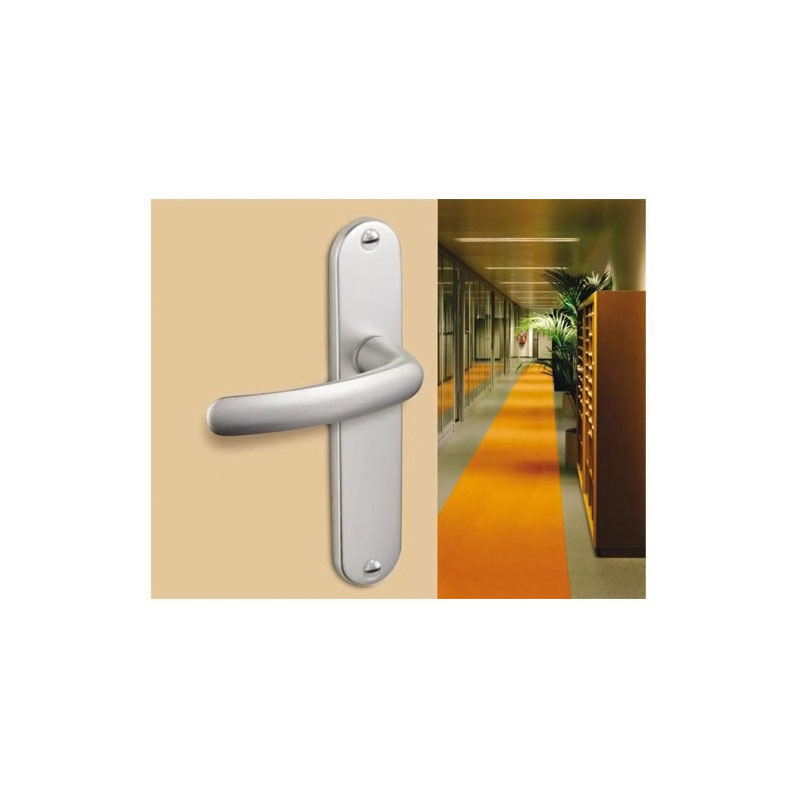Ensemble monobloc : béquilles et petites plaques 185 x 37 mm solidarisées.Plaques en alu embouties avec montage par vis bouchon.Douille de guidage pour pose rapide.Pour porte épaisseur standard de 40 mm et serrure entraxe 70 mm.
