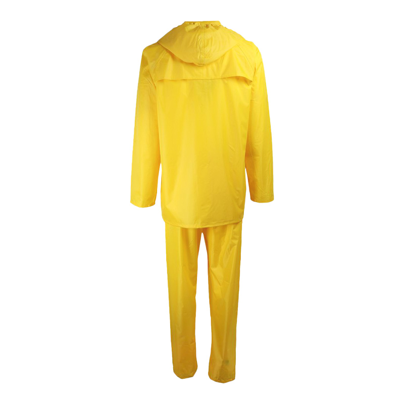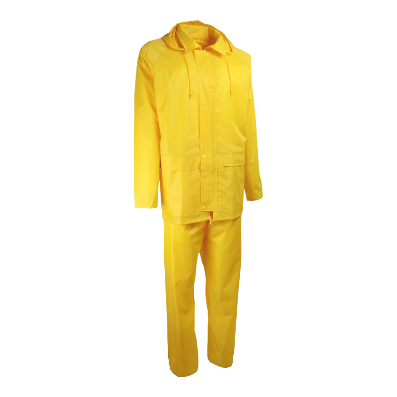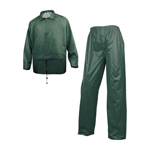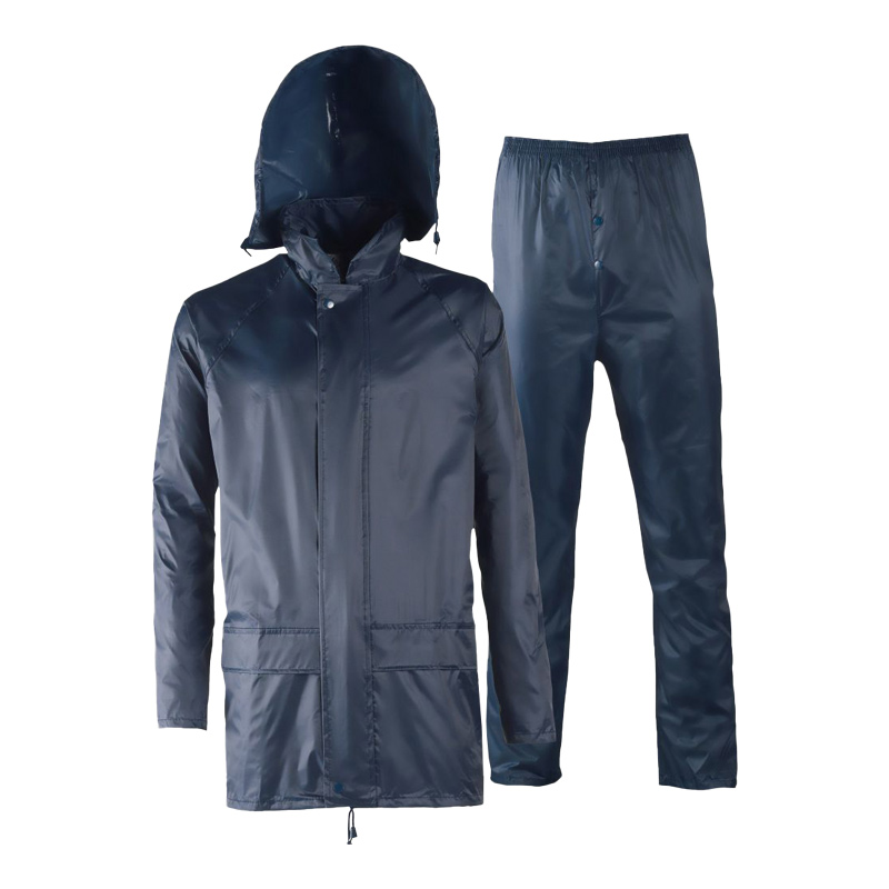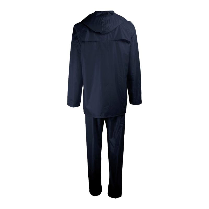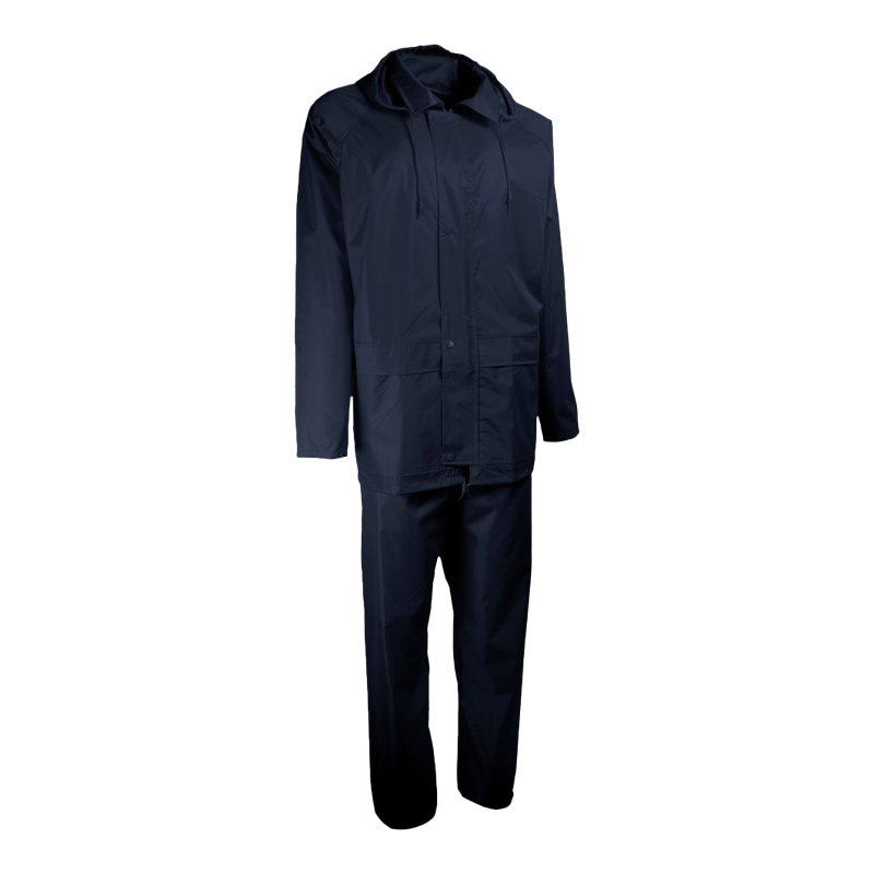 Ensemble veste et pantalon de pluie.Veste :Capuche fixe enroulée dans le col (serrage par cordon).Fermeture à glissière sous rabat à pressions.2 poches latérales avec rabat.Dos ventilé. Serrage à la taille par cordon. Pantalon:Braguette et pressions. Serrage élastique à la taille.Ajustement en bas des jambes par pressions. Passe-mains.Coutures soudées pour l'imperméabilité.Matière très souple et légère.Finition soignée.Coutures étanches.
