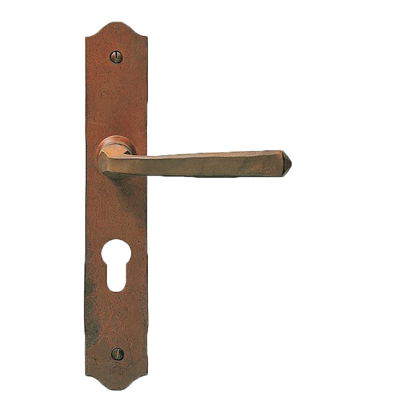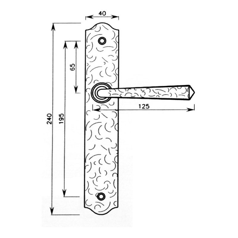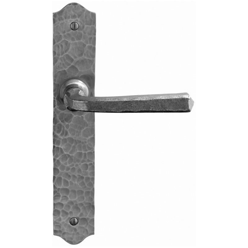 Double béquille sur plaques martelées 240 x 40 mm.Livré avec carré de 7mm et vis relieur.Pour porte épaisseur 38 à 48 mm.Résistance à la corrosion : grade 3 - utilisation possible en extérieur avec pluie ou rosée occasionnelle ou fréquente (essai 96h).