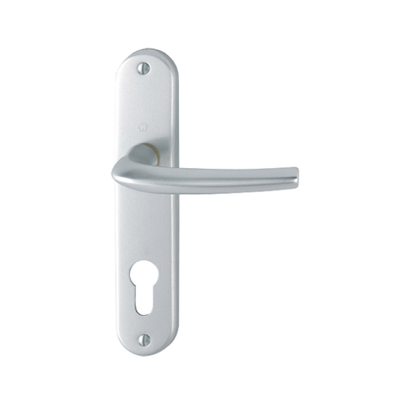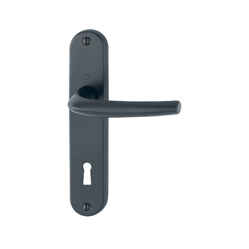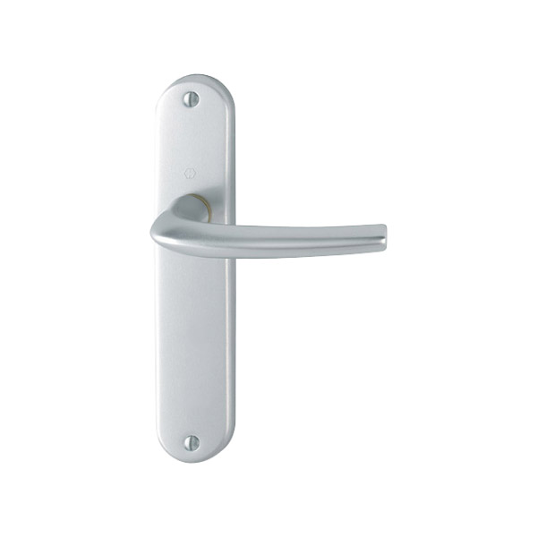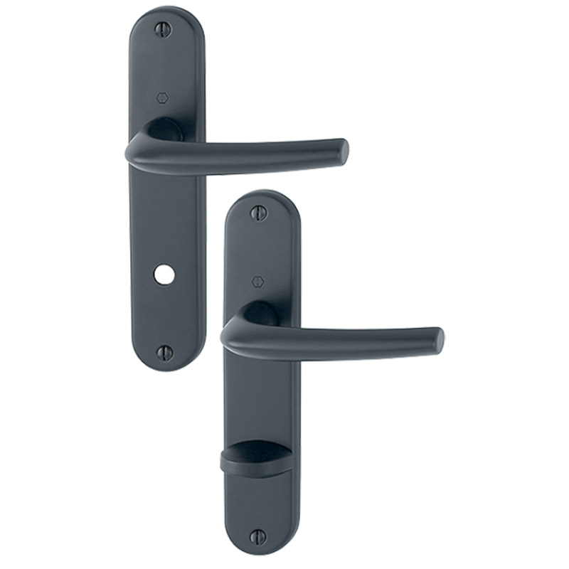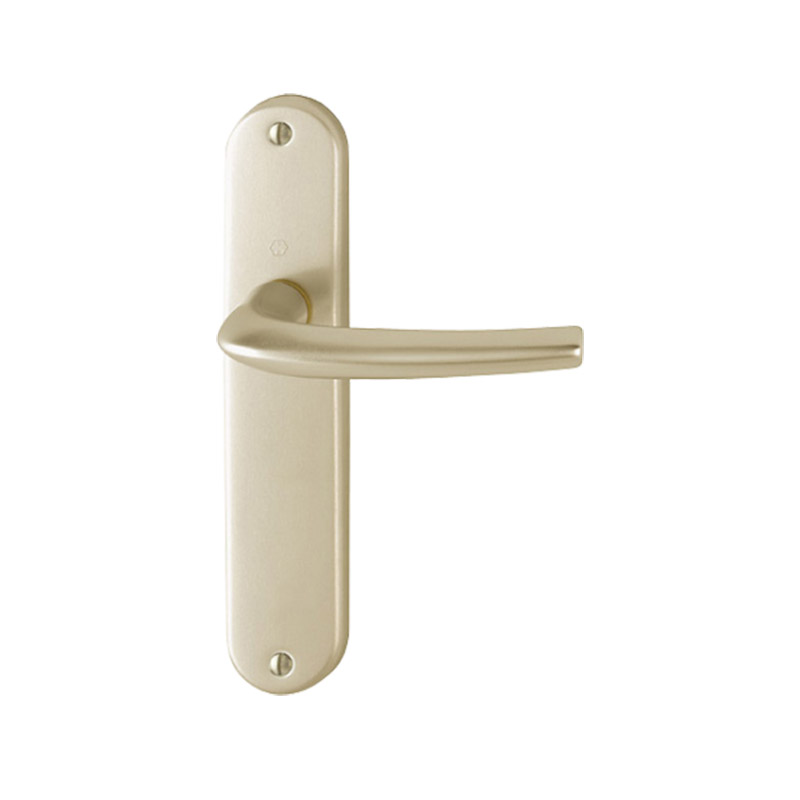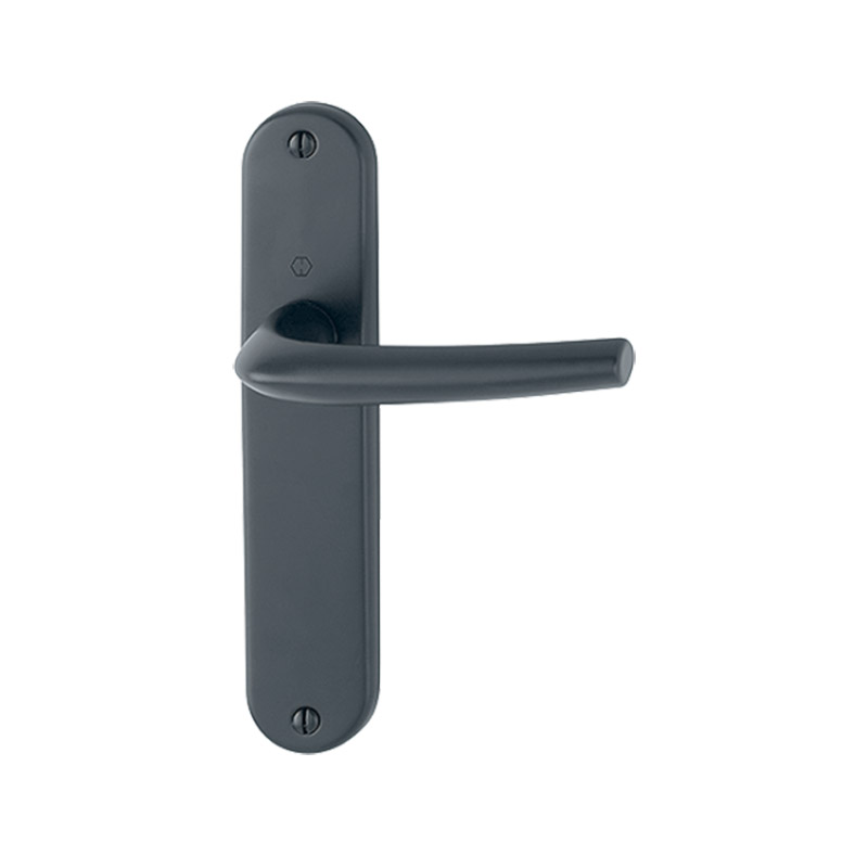 Garniture sur plaques courtes 186x37mm, pour porte intérieure.Assemblage : garniture monobloc, bagues de guidage sans entretien.Liaison : carré plein HOPPE.Fixation : visible, traversante, vis filetées M4 avec douilles filetées.Pour serrure EA 70mm.Pour porte d'épaisseur 40 à 46mm (40mm pour modèle conda/déconda).