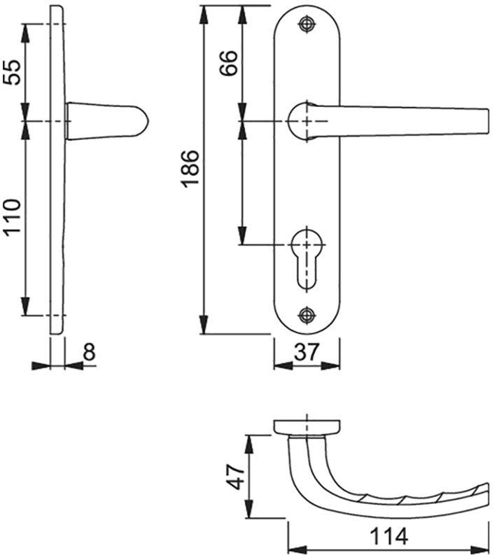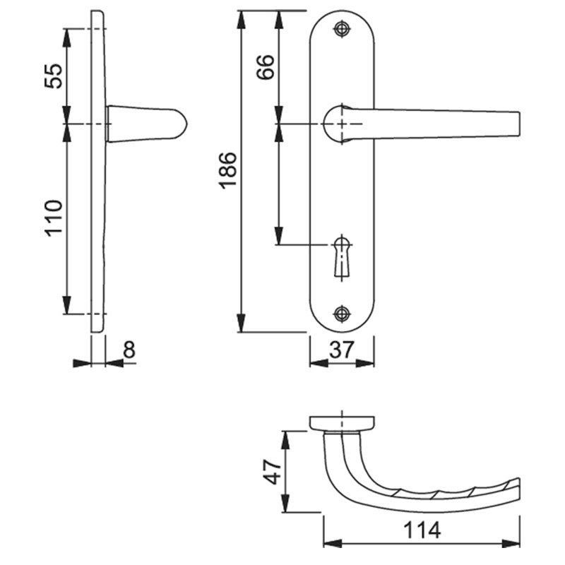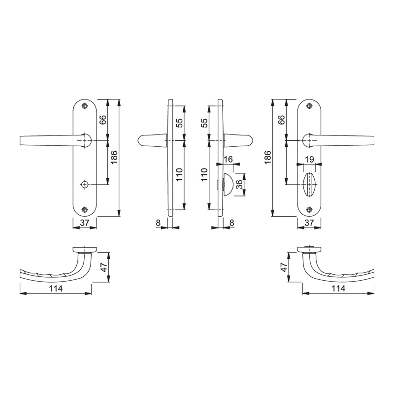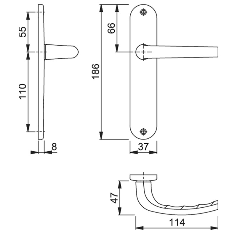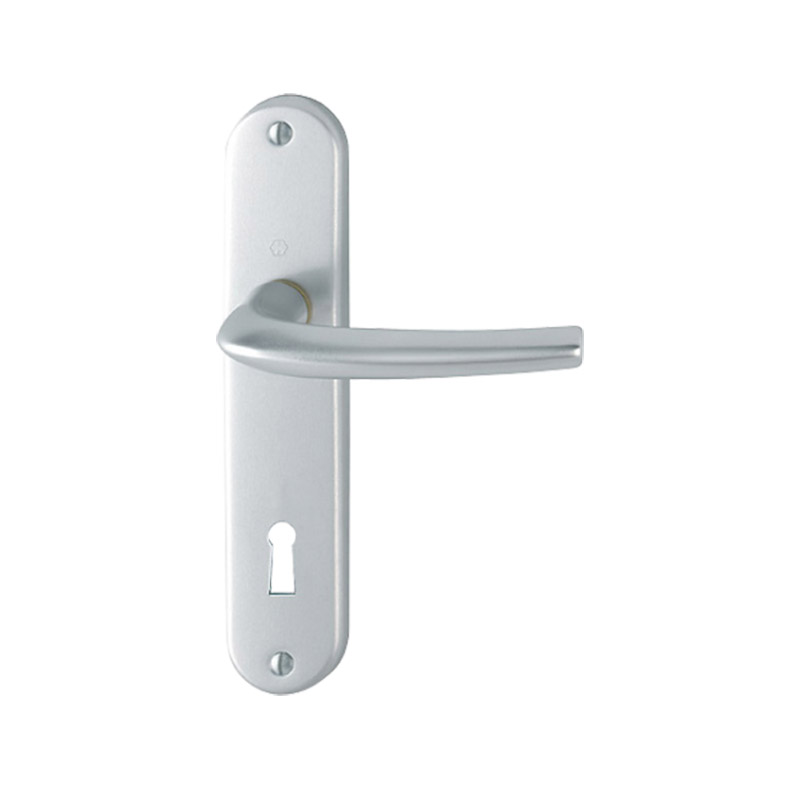 Garniture sur plaques courtes 186x37mm, pour porte intérieure.Assemblage : garniture monobloc, bagues de guidage sans entretien.Liaison : carré plein HOPPE.Fixation : visible, traversante, vis filetées M4 avec douilles filetées.Pour serrure EA 70mm.Pour porte d'épaisseur 40 à 46mm (40mm pour modèle conda/déconda).