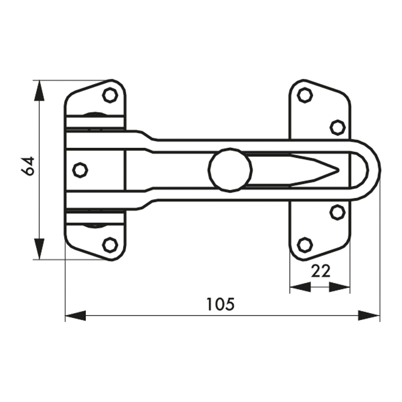Bras longueur 105 mm.Platine et gâche hauteur 64 mm x largeur 22 mm.