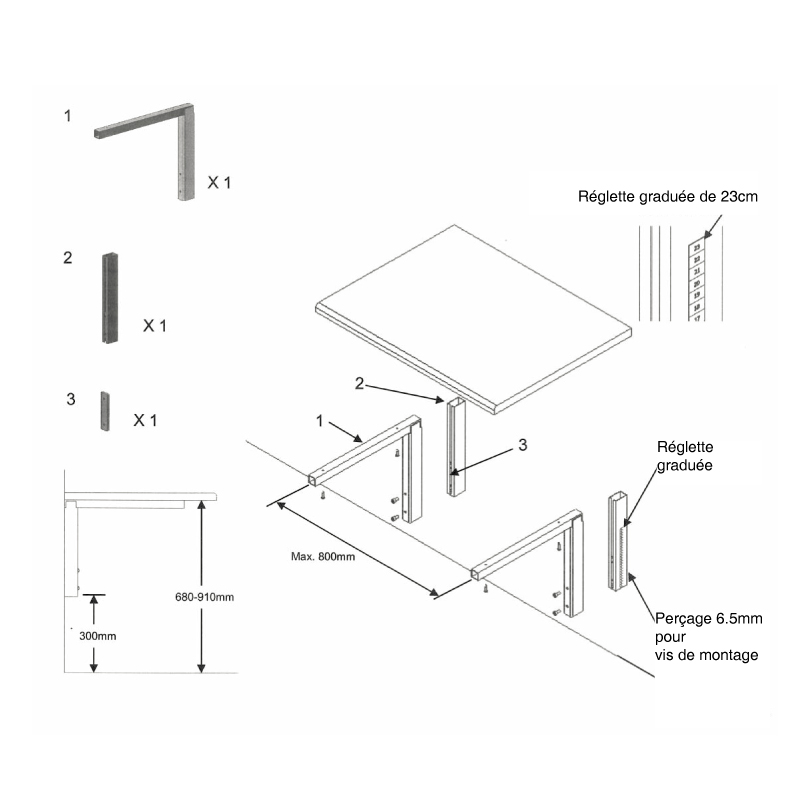 Le nombre d'équerres nécessaires dépendra de la longueur du plan de travail :- de 600 à 1000 mm : 2 équerres- de 1000 à 2000 mm : 4 équerres- de 2000 à 2500 mm : 5 équerres- de 2500 à 3000 mm : 6 équerres