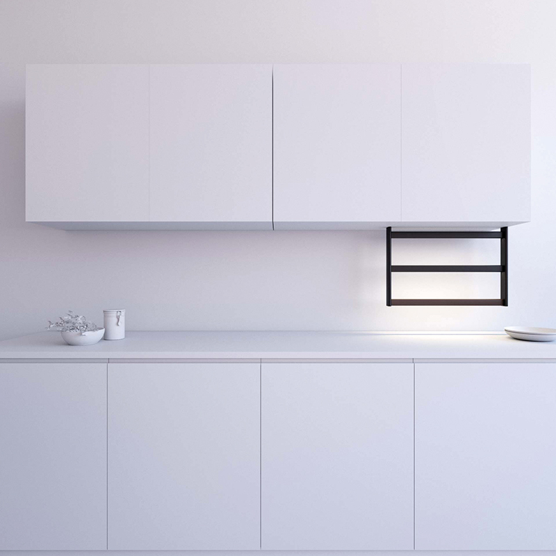 Système de crédence suspendu et extrêmement léger, conçu pour optimiser l'espace entre le meuble haut et le plan de travail, libérant le plan de travail d'encombrements inutiles. Grâce à la fixation innovante au meuble haut, Hang contrairement aux structures murales, permet d'éviter les usinages et perçages dans la crédence, qui peuvent endommager le revêtement ou en cacher sa valeur. La structure modulaire, composée de profils verticaux et horizontaux, s'intègre parfaitement dans n'importe quelle cuisine, devenant le prolongement naturel du meuble haut.