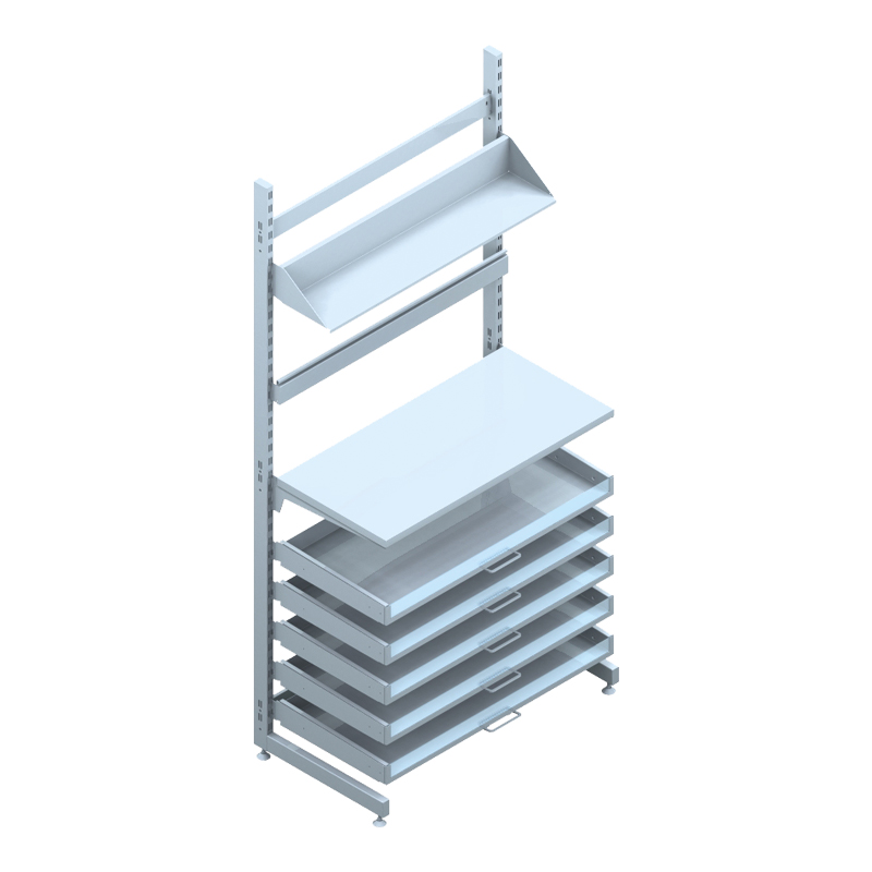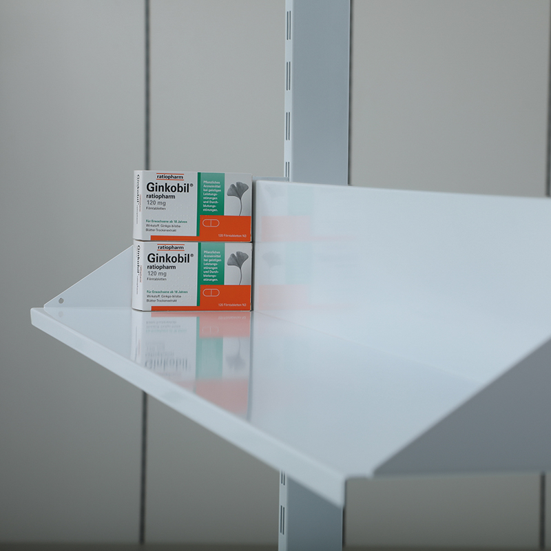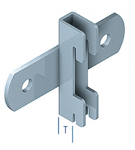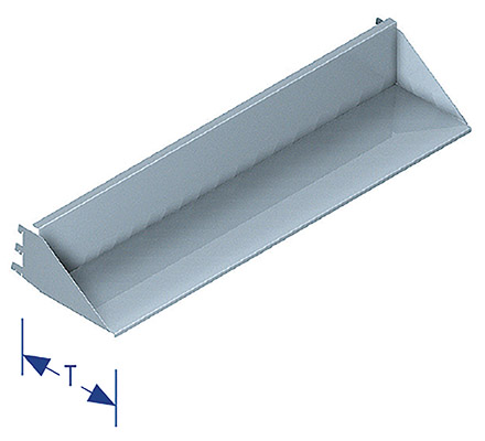 Inclinable de 10° vers le haut.Support à trois crochets pour fixation sur montants de gondoles à perforation au pas de 50mm.