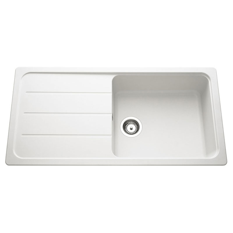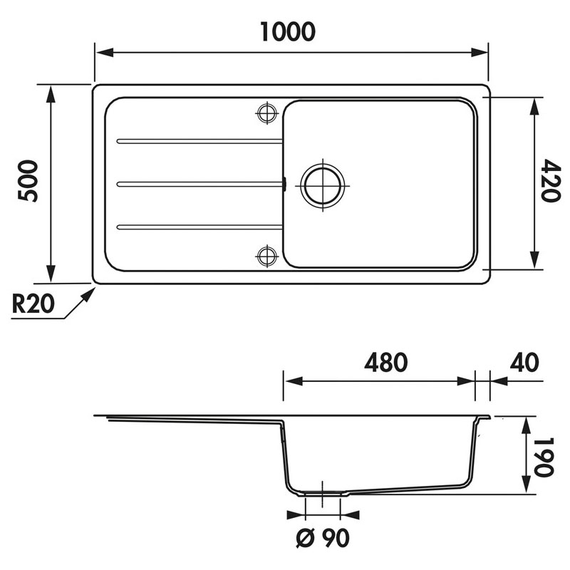 1 grand bac + 1 égouttoir.Vidage manuel. Montage réversible. Egouttoir droite ou gauche.Non percé mais avec pré-perçage.Livré avec fixations, siphon et bonde inox Ø90mm.