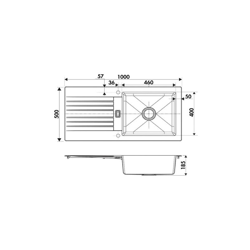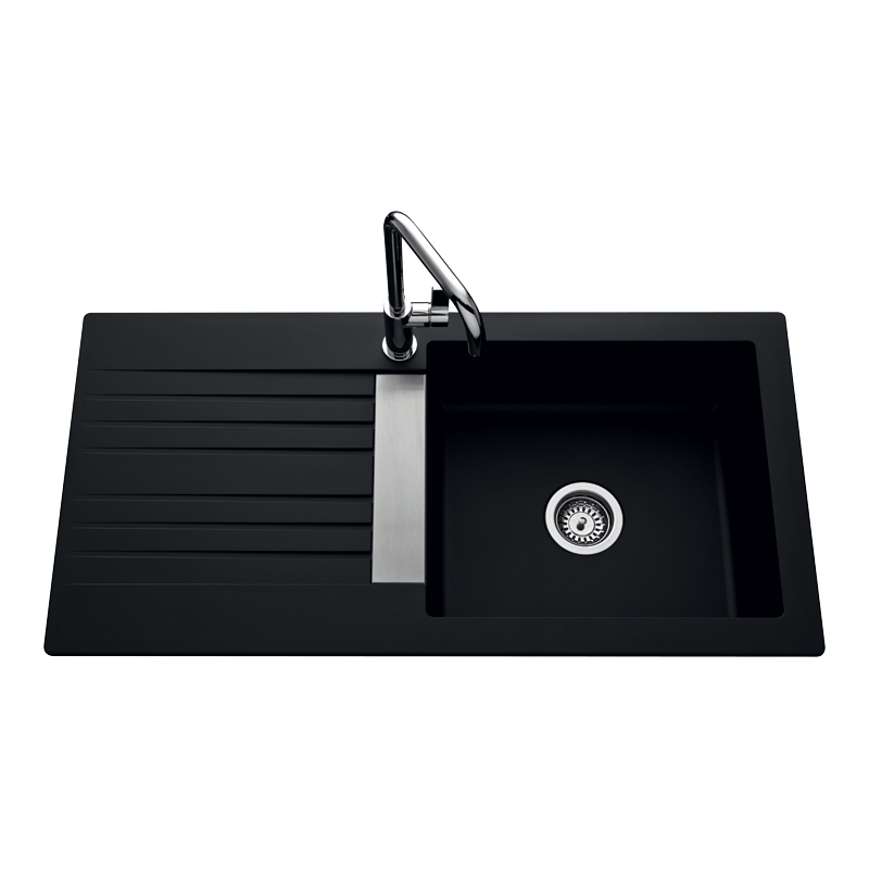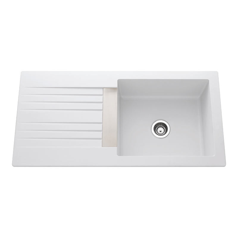 1 grand bac + 1 égouttoir.Vidage manuel.Montage réversible. Egouttoir droite ou gauche.Non percé mais avec pré-perçage.Livré avec fixations, siphon et bonde inox Ø90mm.Livré sans robinetterie.