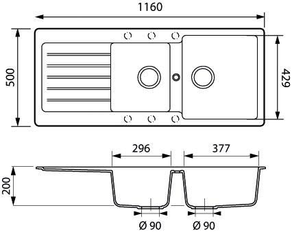 2 bacs + 1 égouttoir.Vidage manuel.Montage réversible. Egouttoir droite ou gauche.Non percé mais avec pré-perçage.Livré avec fixations, siphon et bonde inox Ø90mm.