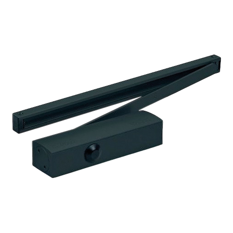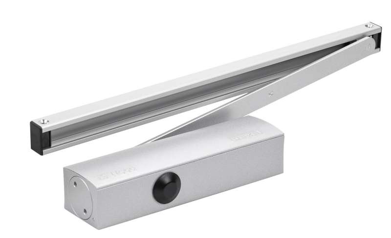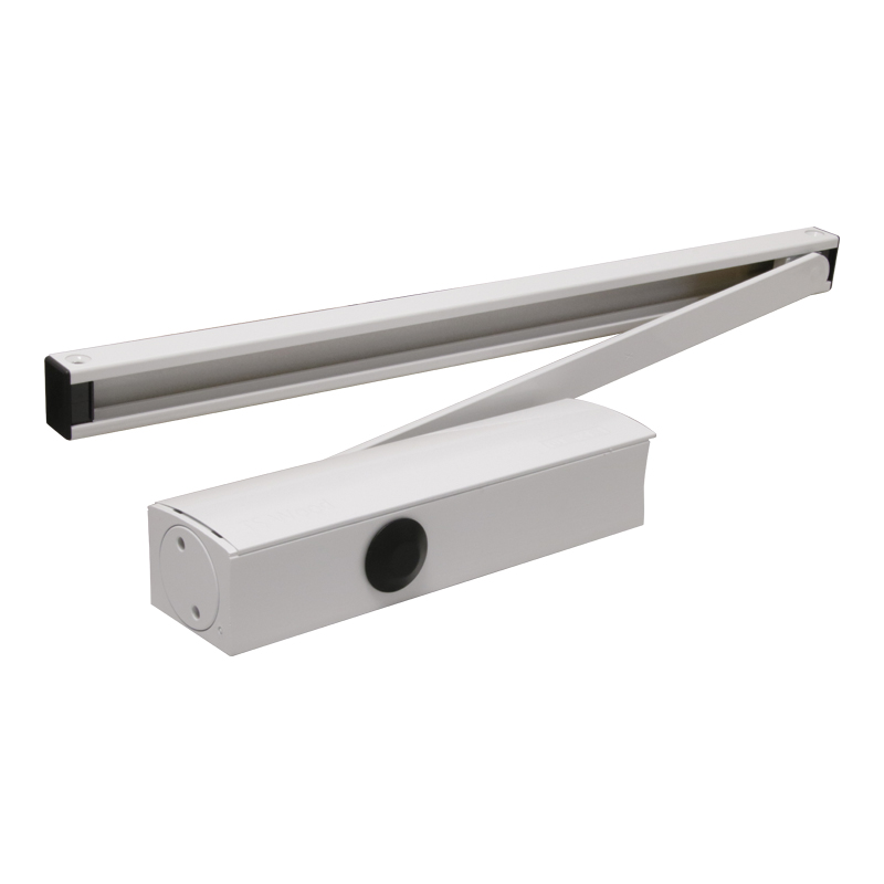 Ferme-porte en applique avec bras à coulisse pour porte battante à 1 vantail et simple action. Montage réversible droite / gauche, côté paumelles ou opposé aux paumelles.Utilisation intérieure.Force fixe EN 3.Vitesse de fermeture réglable.A-coup final réglable.Agréé coupe feu et pare-flamme 2H NF EN 1634.Arrêt mécanique (en option) 80 à 130°NF EN 1154 / CE
