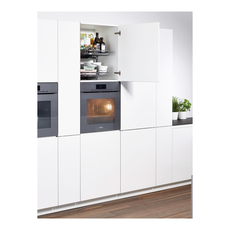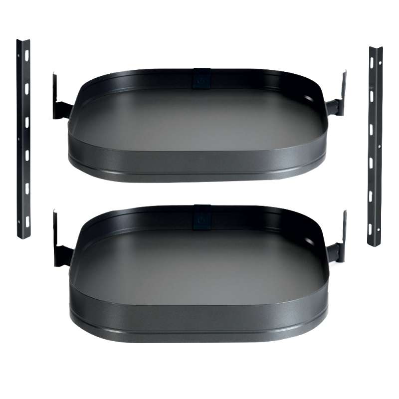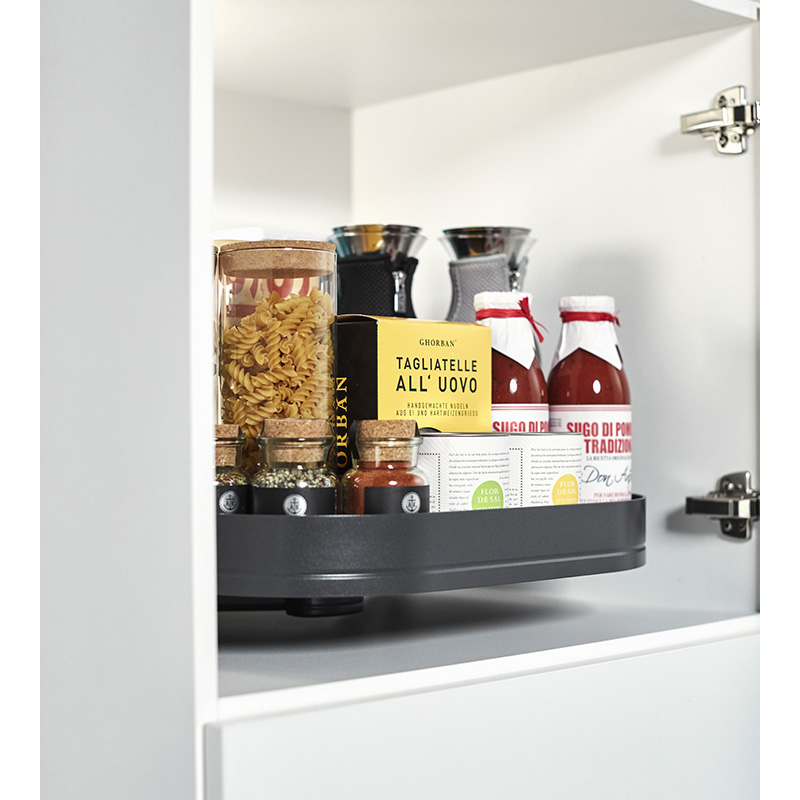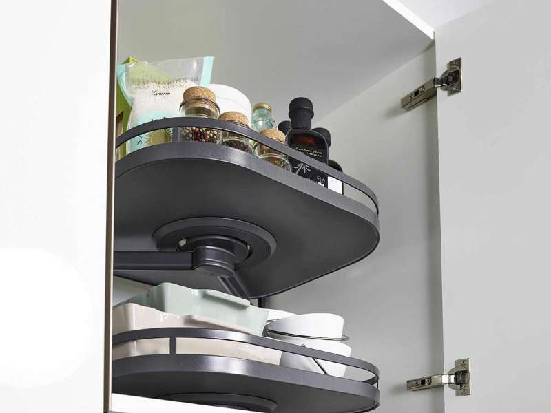 Cette ferrure permet un accès total à l’ensemble des produits stockés sur les plateaux pivotants à 360°. Recommandée pour utilisation en partie haute de colonne à usage divers four, frigo etc…Chaque plateau se positionne et pivote individuellement. Hauteur de plateau réglable.La surface des plateaux est entièrement dégagée : pas d’axe apparent. Fixations latérales sur crémaillères. Montage simple et rapide.Armature et crémaillères en acier recouvert époxy.Ensemble comprenant :