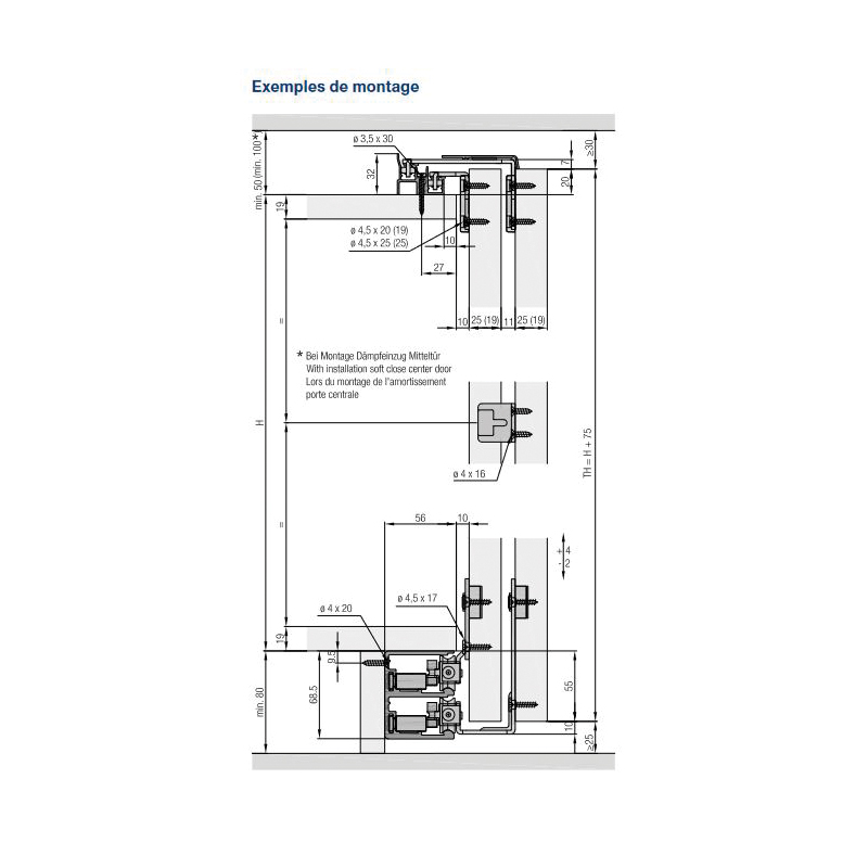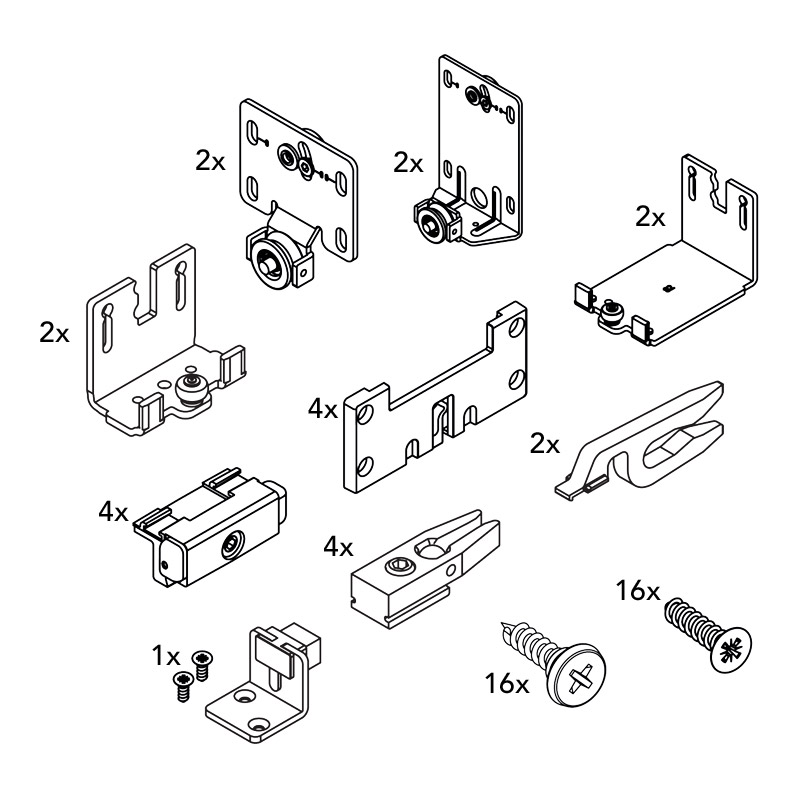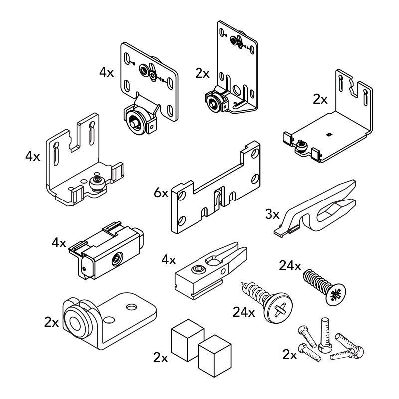 Ferrure pour portes coulissantes à 2 ou 3 vantaux en bois à roulement par le bas.Design Forslide (FS) => Coulissement des portes devant le meuble.Les rails et amortisseurs sont à commander séparément.