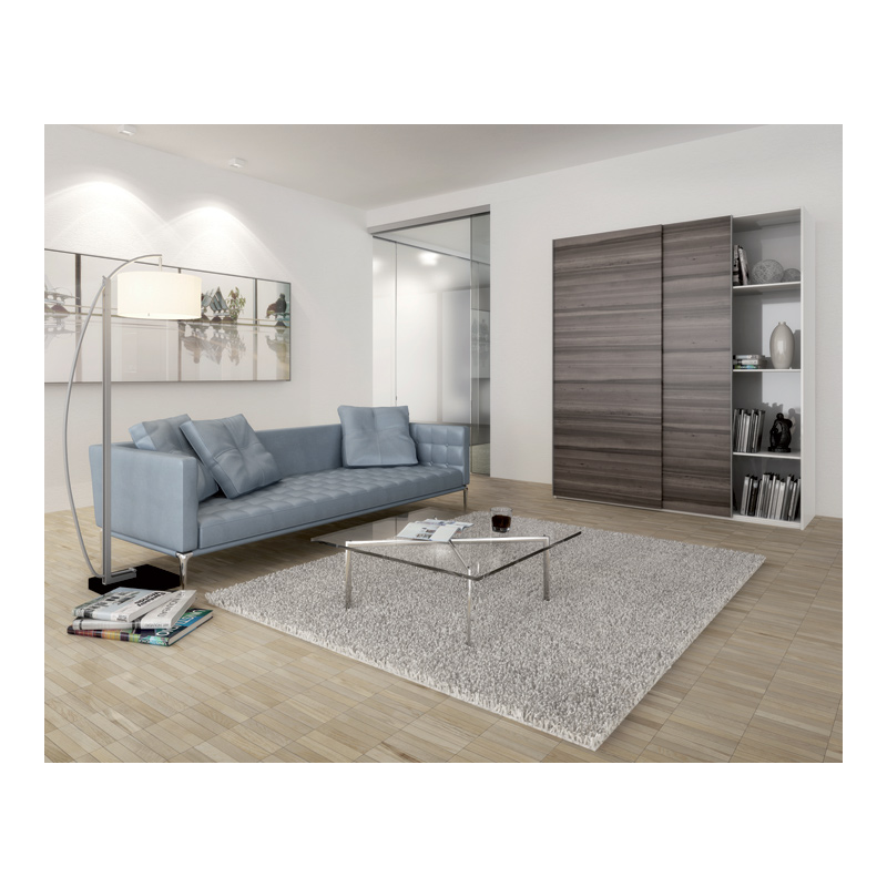 Ferrure pour portes coulissantes à 2 ou 3 vantaux en bois à roulement par le haut. Design Forslide => Coulissement haut et guidage bas devant le meuble.