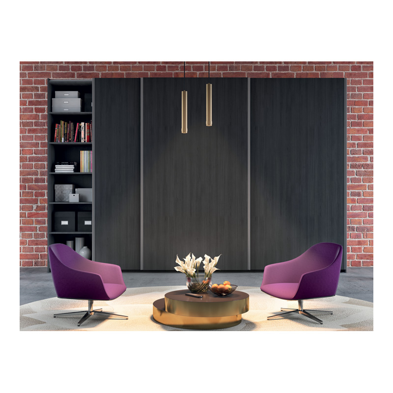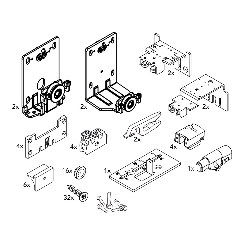 Ferrure pour portes coulissantes à 2 ou 3 vantaux en bois à roulement par le bas.Design Forslide => coulissement devant le meuble.Les rails et amortisseurs sont à commander séparément.
