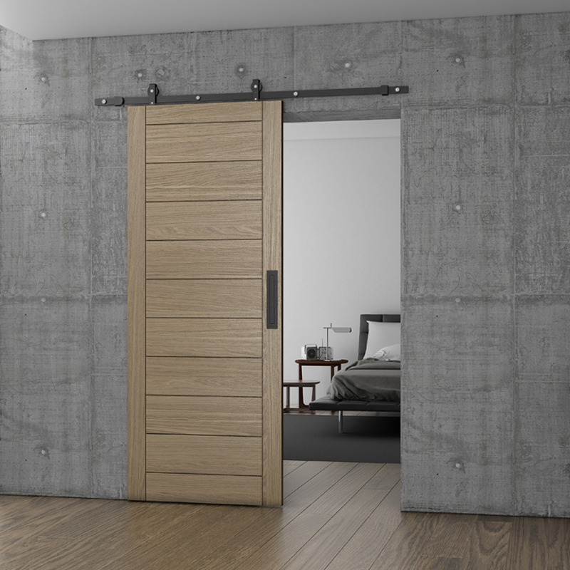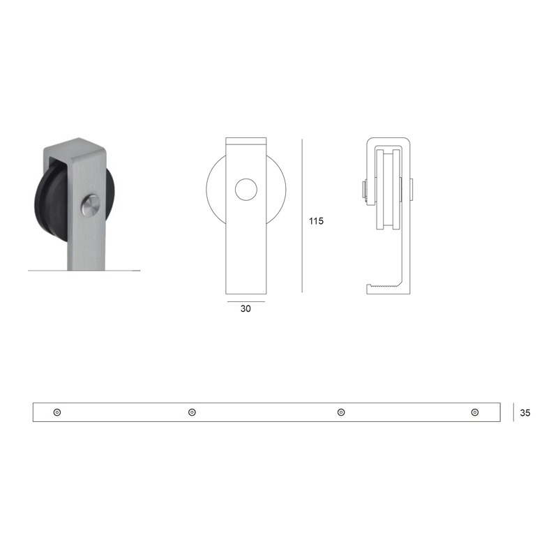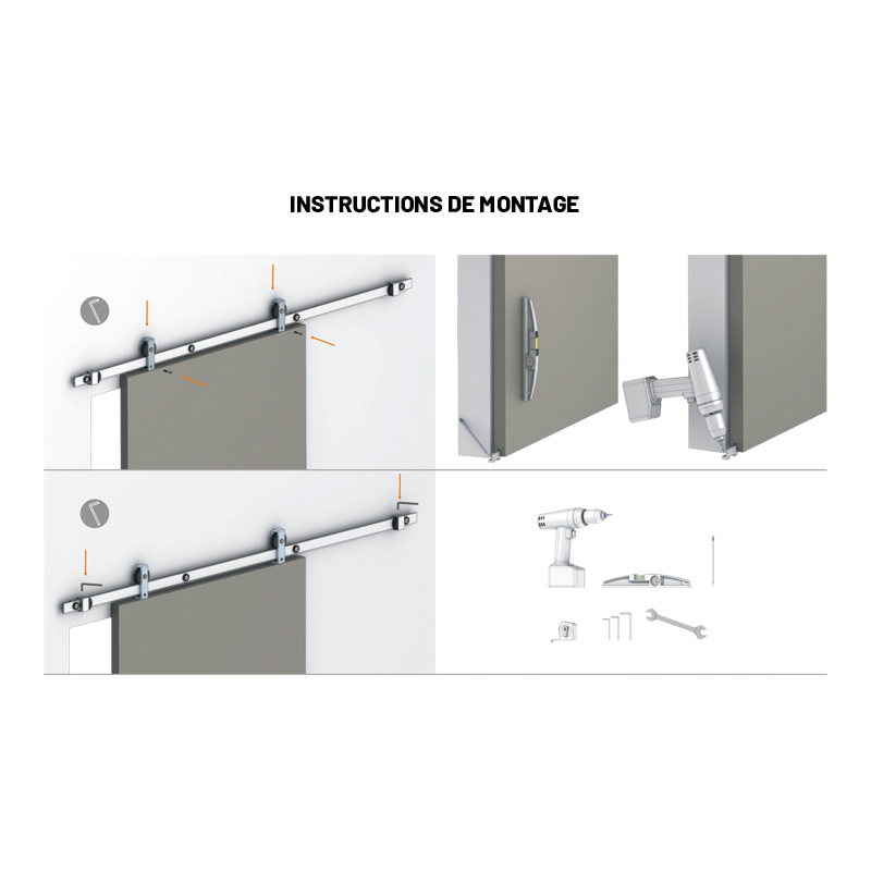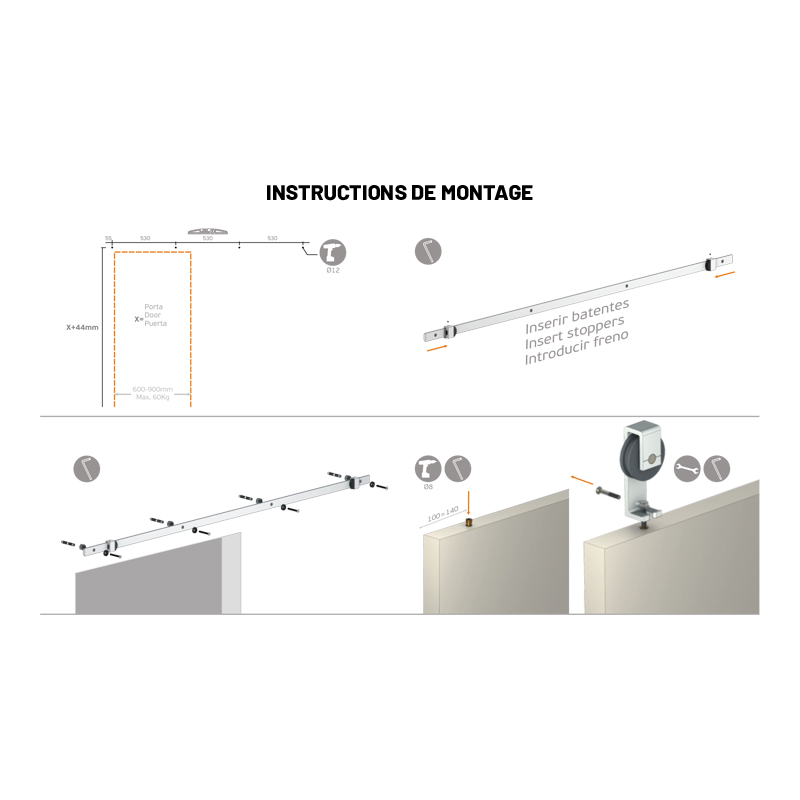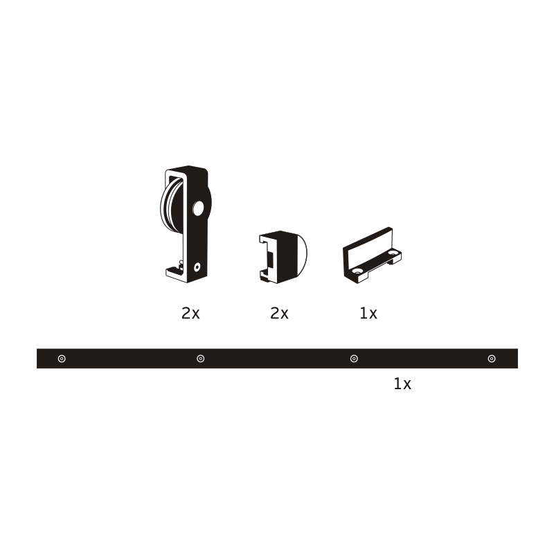 Kit complet chariots et rail pour porte bois coulissante de séparation, type industriel.Composé de 2 chariots à roulette, 2 supports de rail, 1 guide, 1 rail + sachet visserie.