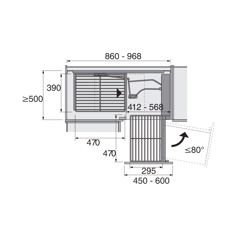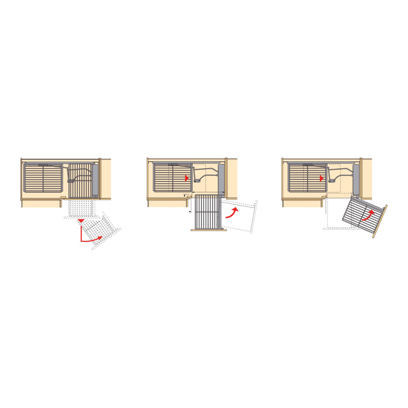 La ferrure fonctionne automatiquement, le cadre avant coulisse hors du meuble.Lors de son extension maximum, le cadre pivote latéralement, faisant ainsi coulisser face à l'ouverture, la partie de la ferrure située dans l'angle mort du meuble.Ouverture assistée.Fermeture silencieuse.Rangement possible dans l'angle mort.Amortisseur intégré.Retour automatique en fin de course.Non réversible.