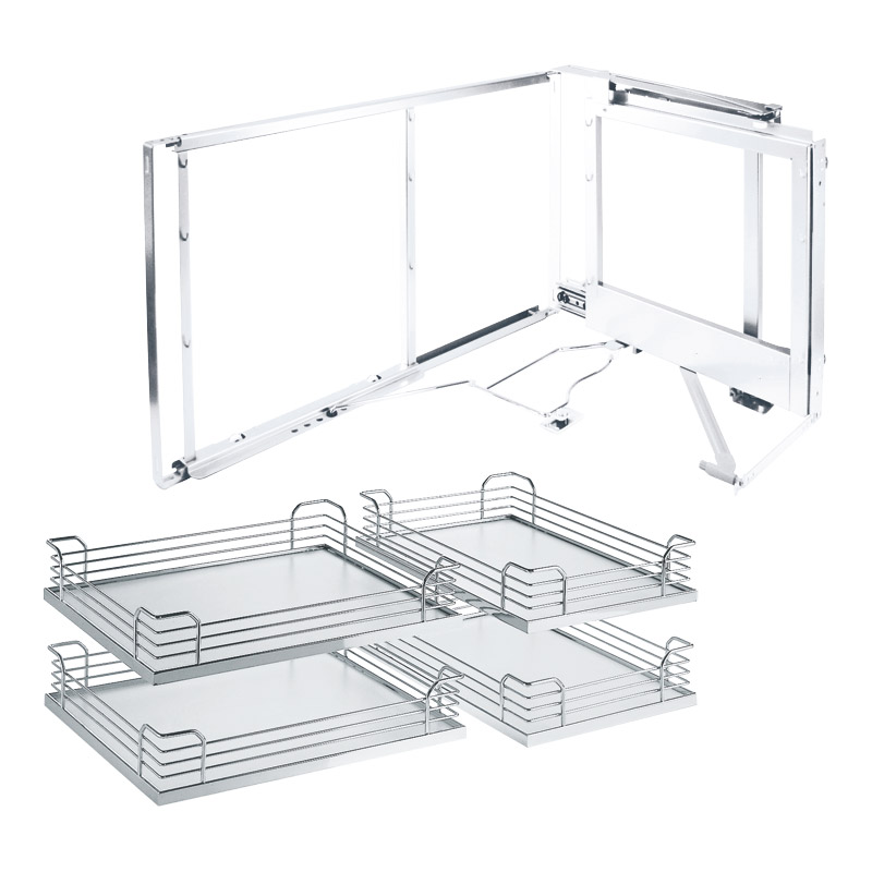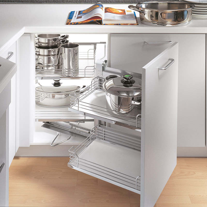 La ferrure fonctionne automatiquement, le cadre avant coulisse hors du meuble.Lors de son extension maximum, le cadre pivote latéralement, faisant ainsi coulisser face à l'ouverture, la partie de la ferrure située dans l'angle mort du meuble.Ouverture assistée.Fermeture silencieuse.Rangement possible dans l'angle mort.Amortisseur intégré.Retour automatique en fin de course.Non réversible.