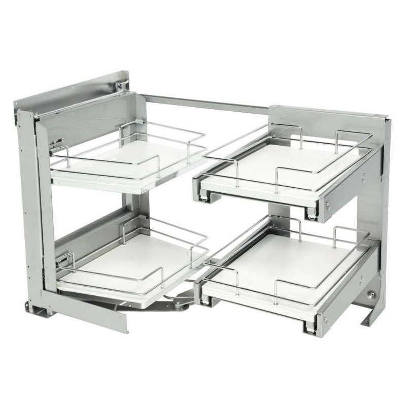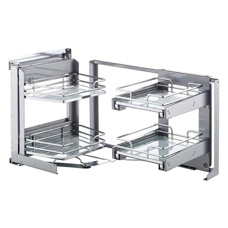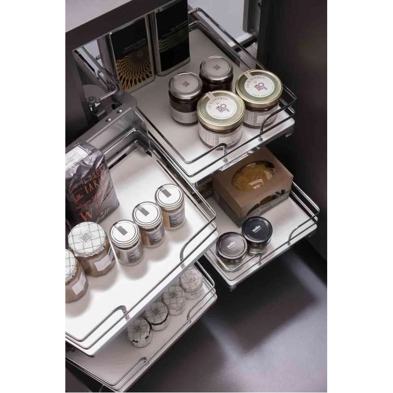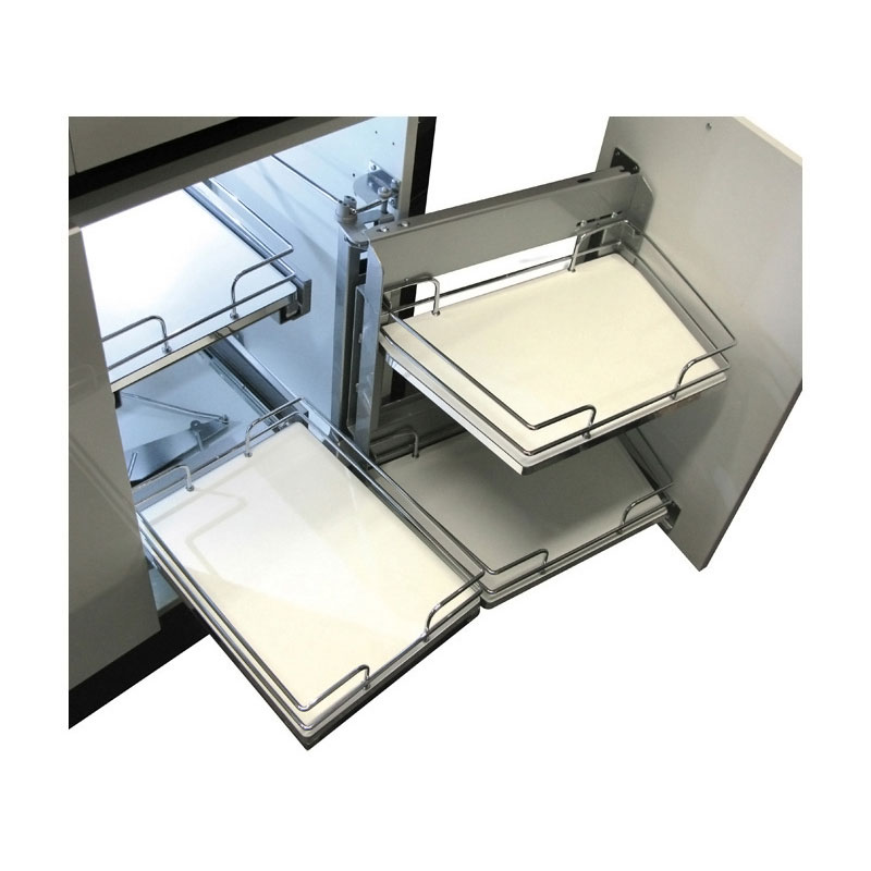L’ouverture de la porte entraîne l’extraction du cadre pivotant, faisant ainsi coulisser face à l’ouverture les corbeilles situées dans l’angle mort du meuble, permettant ensuite de les extraire vers l’extérieur.