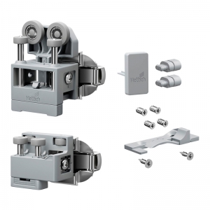 La ferrure de base est composée d'une pièce de coulissage et une pièce de guidage pour une porte pliante avec 2 vantaux et d'accessoires de fixation, sans charnière centrale.