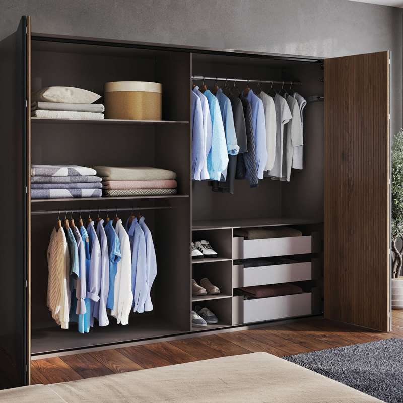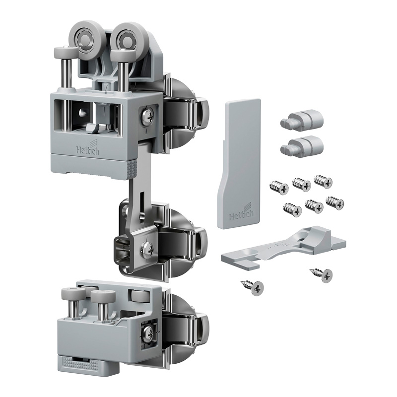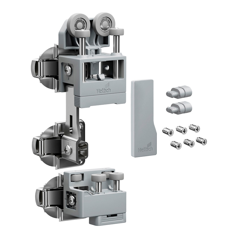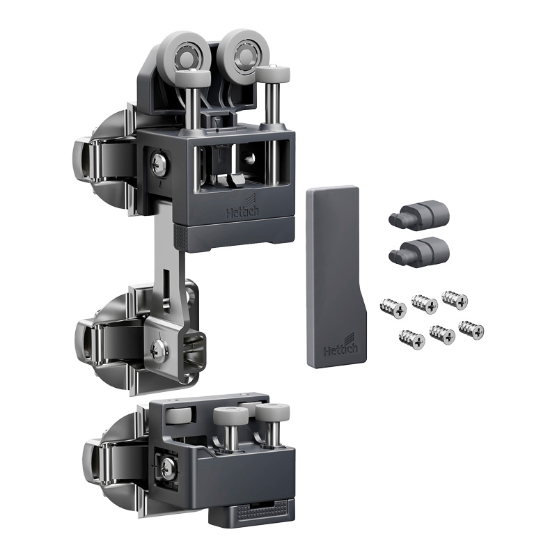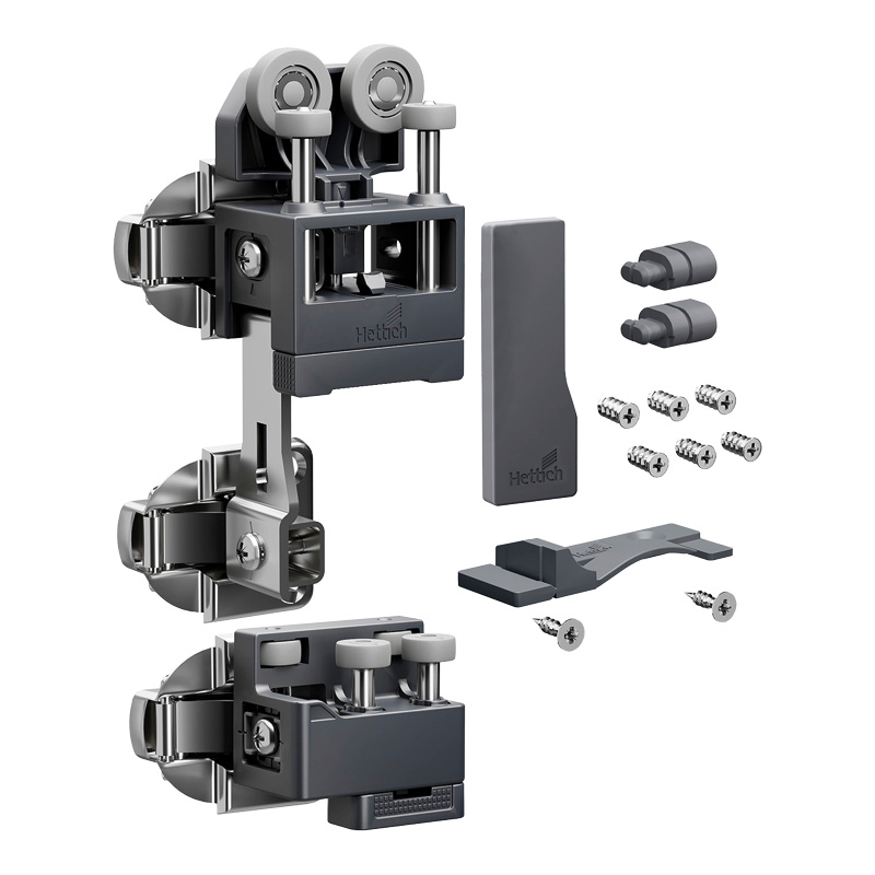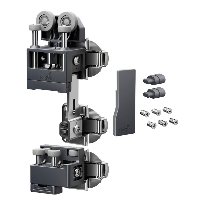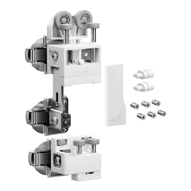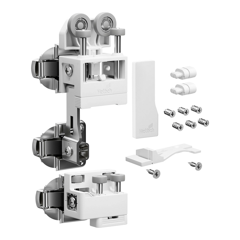 WingLine L permet de réaliser des portes coulissantes pliantes (ouverture 110°) pour les agencements sous escalier ainsi que les placards standards et de grandes dimensions (jusqu’à 2400 mm de hauteur et 600 mm de largeur par vantail).La ferrure de base est composée d'une pièce de coulissage et une pièce de guidage pour une porte pliante avec 2 vantaux et d'accessoires de fixation, sans charnière centrale.