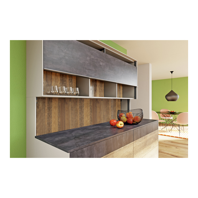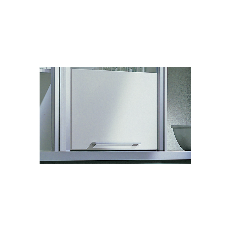 Le système de porte unique coulissant verticalement VerticoMono met l'accent sur l'agencement et la fonctionnalité dans la cuisine et dans tout le salon. La porte, pesant au maximum 15 kg, coulisse dans un profilé aluminium encastré. Le mécanisme déjà préinstallé est masqué par une baguette en aluminium ou en bois.
