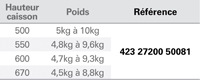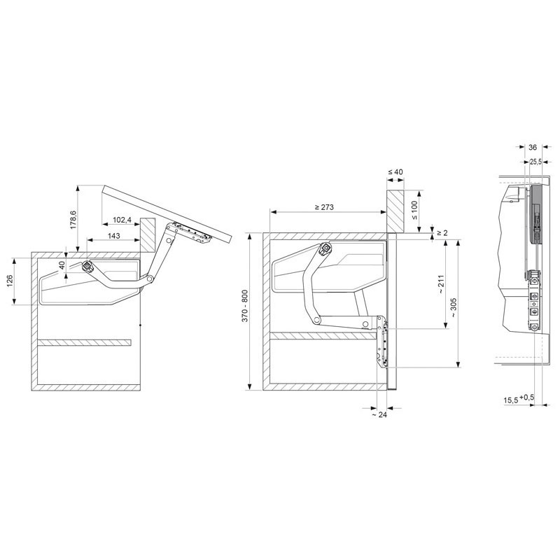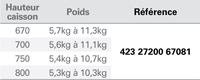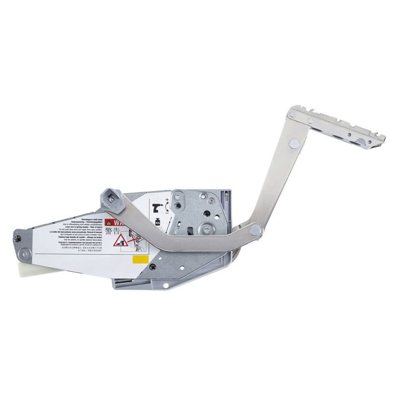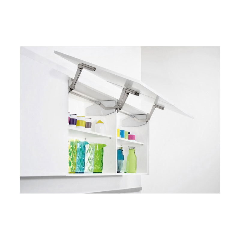 Ferrure de porte relevable inclinée.Pour caisson de hauteur 370 à 800 mm.Profondeur mini 273 mm.Pour porte bois ou porte à cadre aluminium largeur mini 20 mm.Ouverture fractionnée de la porte.Force de fonctionnement réglable.Fermeture amortie.Réglage façade 3D.Ensemble de 2 compas :1 droit et 1 gauche + attaches façade.Montage rapide avec eurovis prémontées.Charge variable suivant poids et dimensions des portes.(Tenir compte du poids du vantail + poignée)Livré sans cache et sans barre de synchronisation.