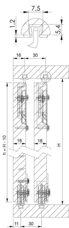 Comprenant la garniture pour 2 vantaux et jeu de rails haut et bas.Ferrure pour porte d’armoire à coulissement par le bas.Pour vantail bois épaisseur 10 à 28 mm.Charge par vantail maxi 50 kg.Rail de roulement simple encastrable longueur 2500 mm.En aluminium argent.Profondeur 5,4 mm, Largeur 7 mm.Guides et roulements avec platine en acier zingué.Pose encastrée larg.35 mm, prof.14 mm.La garniture complète pour deux vantaux se compose de :
