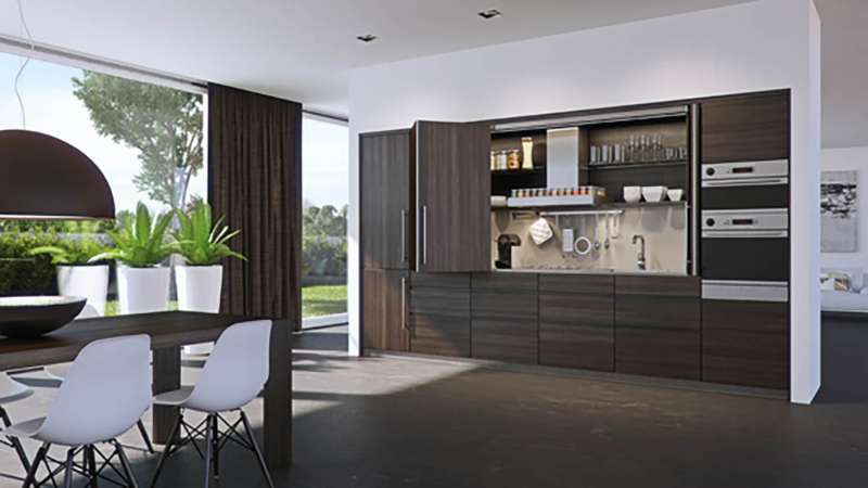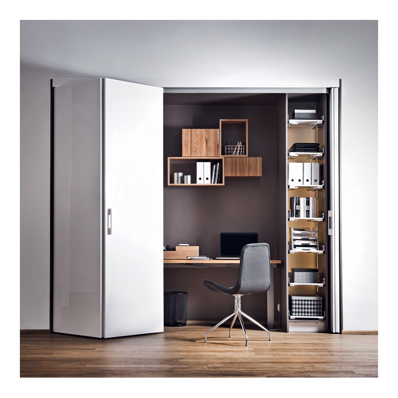 Le système HAWA-Folding Concepta permettra, dans une pièce, de concevoir une cloison escamotable totale (sol-plafond) ou partielle (plan de travail - plafond) entre 2 espaces. Cette cloison pliante et escamotable saura disparaître pour devenir invisible en un tour de main laissant apparaître l’ensemble de l’extension cachée.Fermées, les portes sont parfaitements alignées.Les installations avec une paire de portes pliantes des 2 côtés peuvent être réalisées sans montant central grâce au profil de sol (en option 272 24000 13061).Quelques applications possibles :Dissimuler un coin bureau, coin cuisine, un dressing ou une salle de bain dans une chambre parentale, etc…