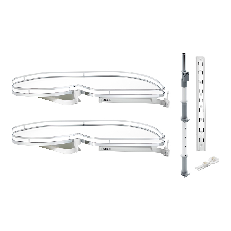 Ferrure pivotante à plateaux extractibles.Composée de 2 plateaux indépendants pivotants et sortants intégralement du meuble facilitant l’accès complet au contenu des plateaux. Réglage des tablettes en hauteur, fonctionnement très fluide et doux aussi bien à l’ouverture qu’à la fermeture. Plateau supérieur réglable en hauteur.Montage simplifié et rapide grâce au clipsage des bras d’entraînement sous le plateau, sur l’axe de pivotement et sur le support latéral.