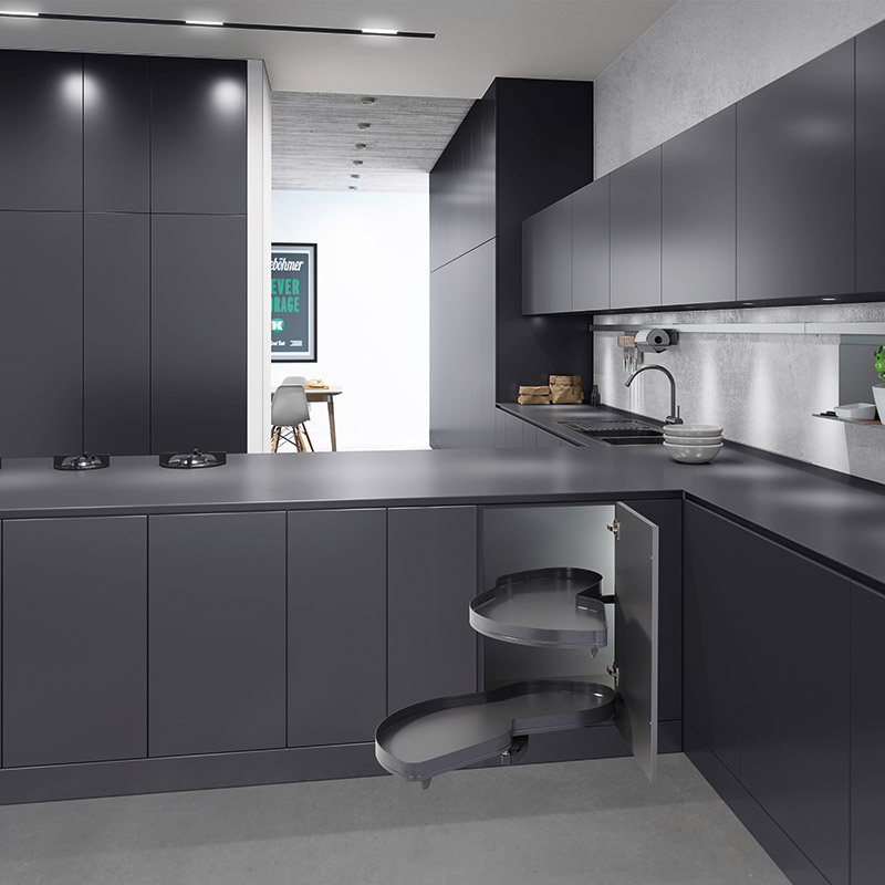 Composée de 2 plateaux indépendants pivotants et sortant intégralement du meuble facilitant l'accès complet au contenu des plateaux.
