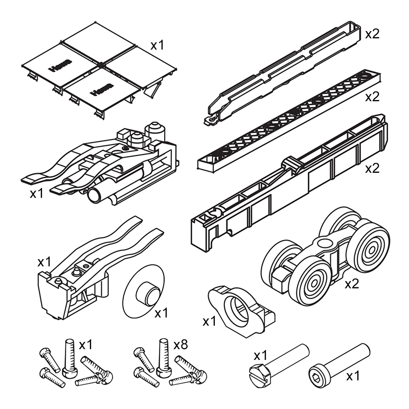 Ferrure Porta 100 HMT Pocket Acoustics pour porte en bois à roulement par le haut avec rail de roulement en applique ou affleurant avec le plafond. Montage possible de la porte dans le galandage après achèvement des travaux.A commander séparément :