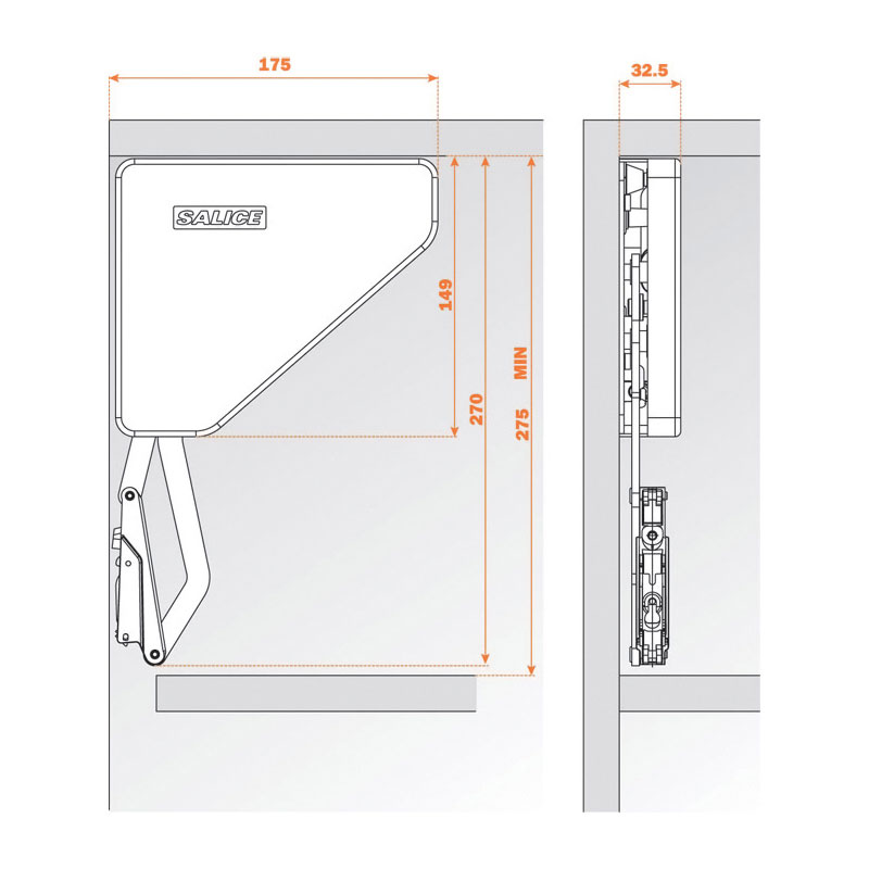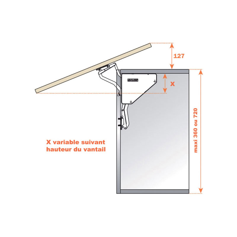 Tableau établi, avec 2 vérins pour ouverture fractionnée et largeur de meuble jusqu’à 1200.