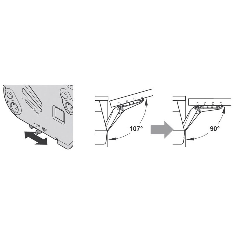 2 versions FREEflap forte D et FREEflap forte FPour caisson hauteur 350 à 650 mm.Profondeur mini 130 mm.Angles d’ouvertures 90° et 107°.Ensemble de 2 compas : 1 droit et 1 gauche avec 2 attaches façade et 2 caches gris.Montage rapide avec eurovis prémontées ou par vis bois.Charge variable suivant poids et dimensions des portes.(Tenir compte du poids du vantail + poignée).