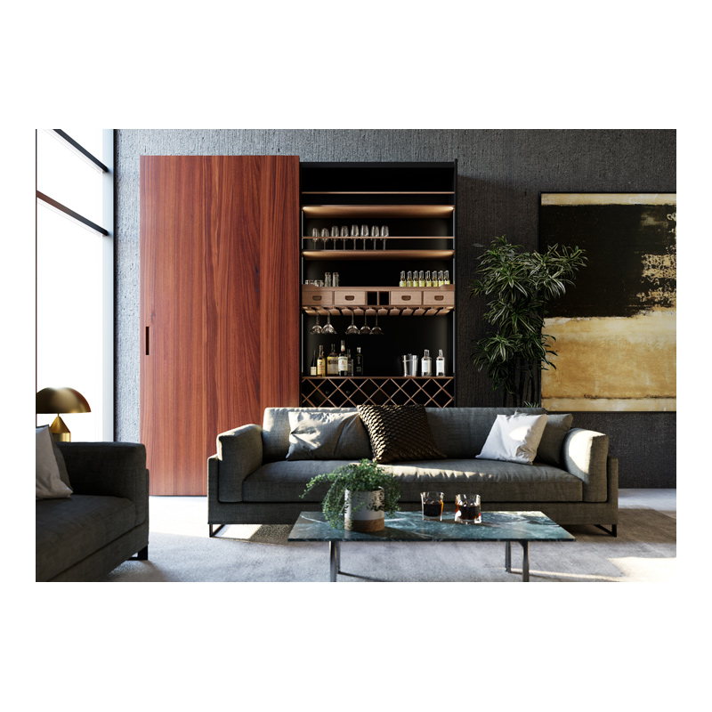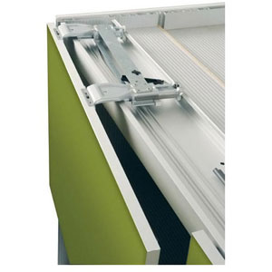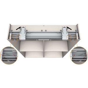 En plus de l'équipement de base, la façade du mécanisme d'entrainement supérieur est équipée d'un profil clipsable habillable. Ce qui la rend invisible.Le profil de guidage inférieur est équipé, suivant sa dimension, de 2 ou 3 vérins de socle pour mise à niveau du meuble.