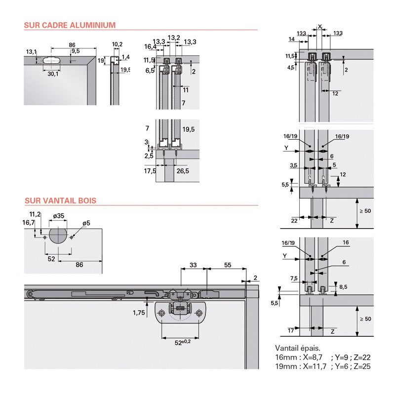 Garniture pour 2 vantaux.Avec réglage en hauteur sans outils intégrés.Livré sans rail.