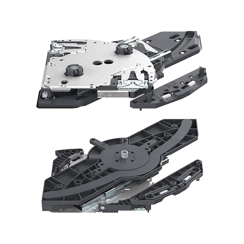 Push to open amorti intégré dans la ferrure supérieure ou inférieure (à choisir en fonction de la hauteur du meuble et de la position de montage).