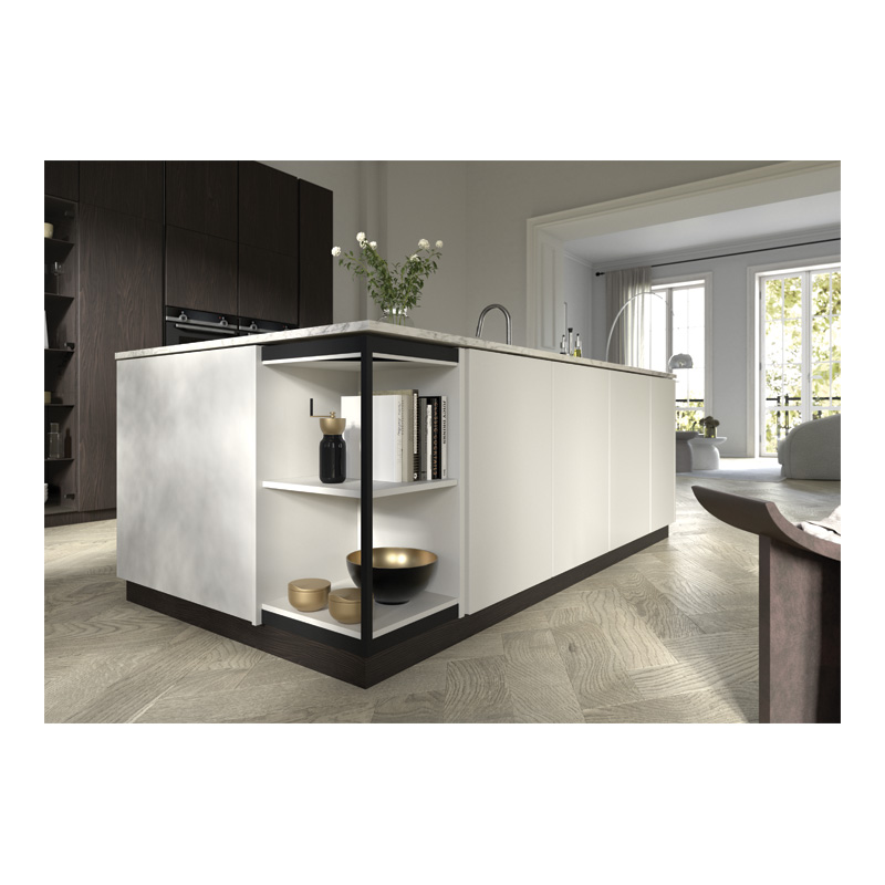 Un élément mural de cuisine haut de gamme comme élément marquant l’espace.Un meuble de cuisine ouverte compact avec de nouvelles solutions de rangement représentatives pour un habitat ouvert.