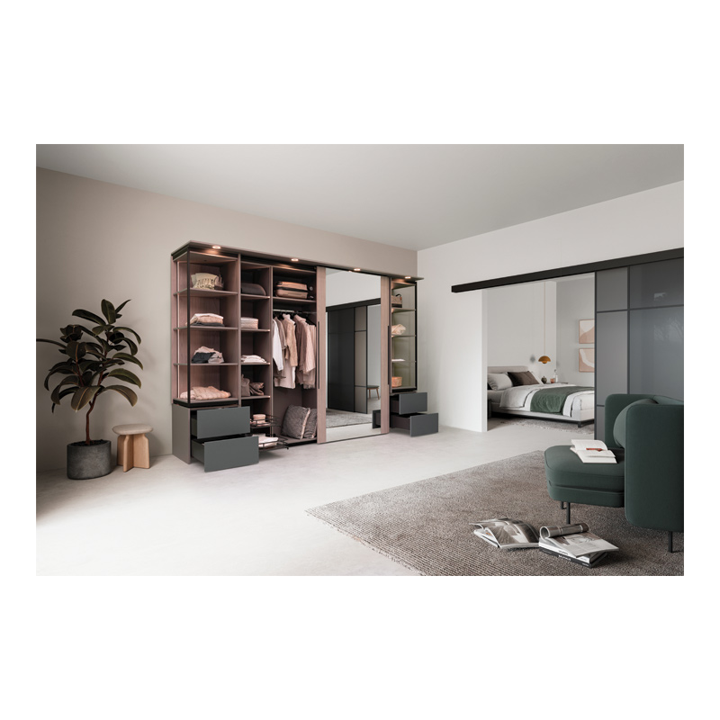 Une étagère de salon transformable haut de gamme. Bien plus qu’une simple étagère de salon :un meuble magique pour une expérience hors du commun.Une rotation élégante suffit pour que le meuble dévoile tout ce qu’il a enlui. Avec une touche supplémentaire, l'intérieur du meuble disparaît de la vue et les meubles présentent à nouveau des façades fermées. « The Joy of FurnSpin » de Hettich fascine dans les différents univers du meuble.