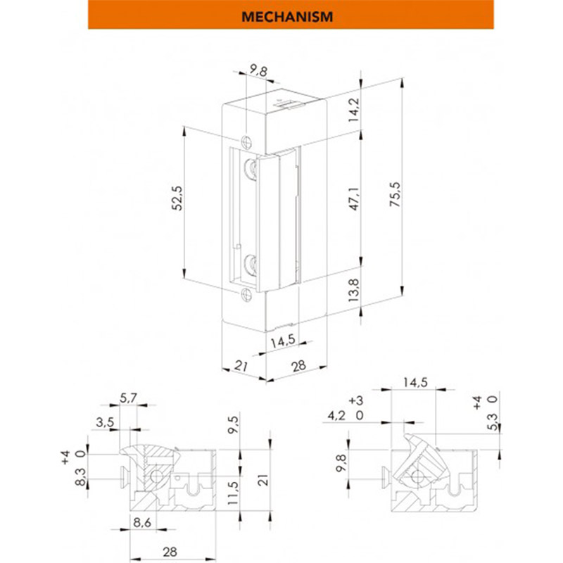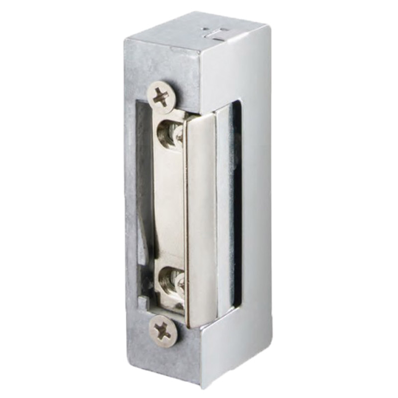 Gâche électrique à larder symétrique, sans têtière, série 45 avec Flex (pêne demi-tour réglable).