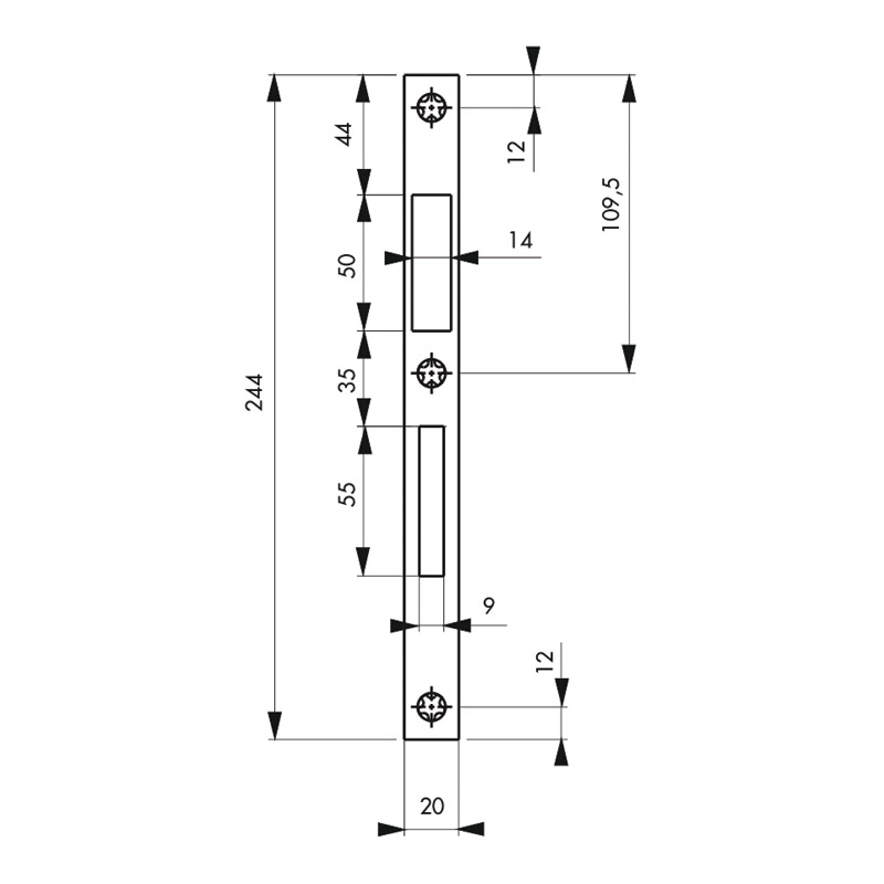 Gâche plate à double empénage 244 x 20 x 1,5mm.