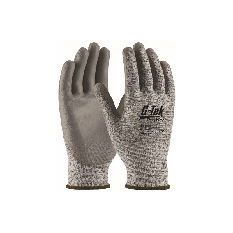 Gant tricoté sans couture en PolyKor enduction en polyuréthane sur la paume et bouts de doigts excellente dextérité, sensibilité tactile et résistance aux coupures la structure sans couture augmente le confort et la respirabilité le poignet en tricot empêche la saleté et les débris de pénétrer dans le gant pour milieux sec et légèrement humide / huileux.