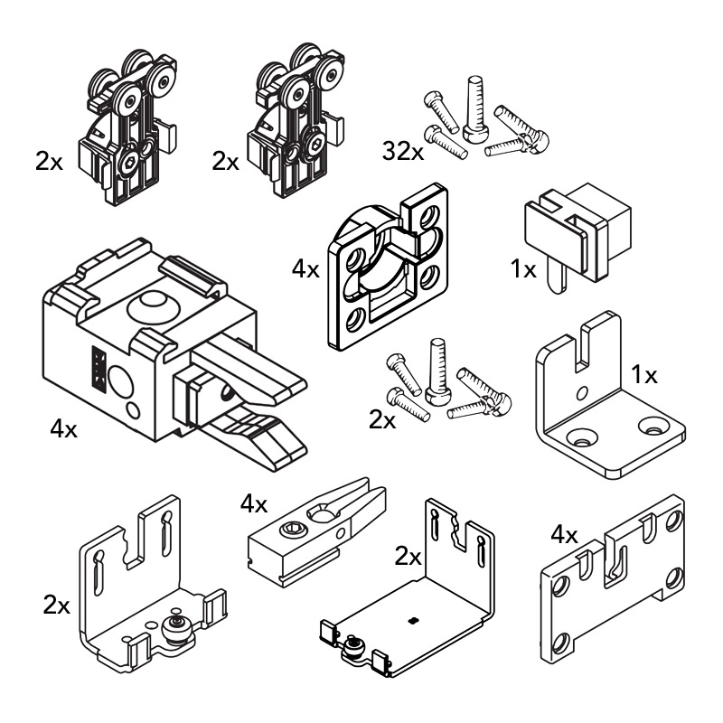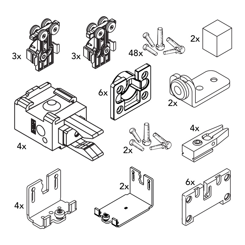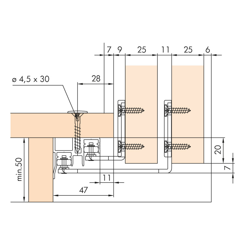 Ferrure pour porte de meuble coulissante en bois.Porte à roulements suspendus encastrés et guidage bas en façade.Garniture complète livrée sans rail.Fonctionne en douceur et en silence.Amortisseur (en option) intégré dans le rail.